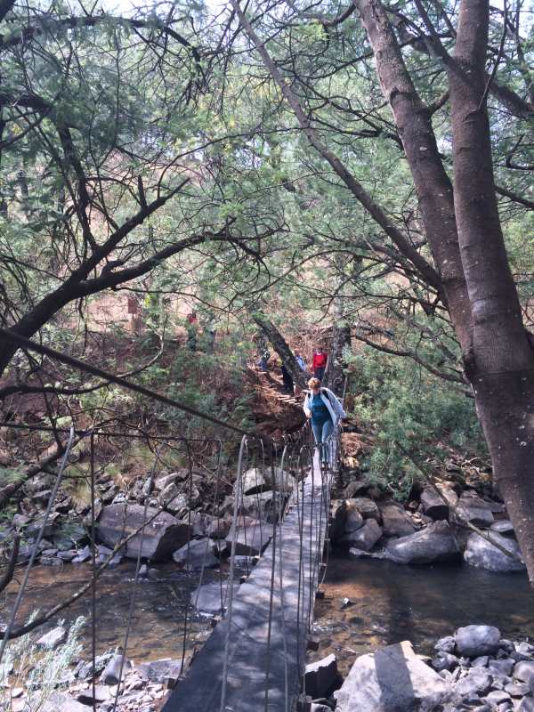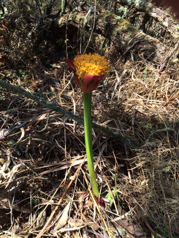 We then progressed upwards through an indigenous forest along a well marked path. We passed a wonderful waterfall and then up a thirty foot ladder. The path then followed this contour for another kilometer, eventually dropping back down to the Mooi River. There were lots and lots of snake lilies and other wild flowers along this route. When we got out of the forest our leader Sven had an unexpected citing of a black backed jackal that was as surprised to see him as he was and turned tail and disappeared. The benefits of being a leader!! Another wobbly swing bridge to conquer and two and half kiolmetres back to the finish. The weather turned again with overcast skies and thunder in the distance. We then scurried back along the meandering Mooi, crossing two more suspension bridges and going through the grove of poplar tress after which the farm is aptly named. Four hours of beautiful hiking through a selection of terrains and four seasons thrown into a morning! Only a few drops of rain on the final stretch.