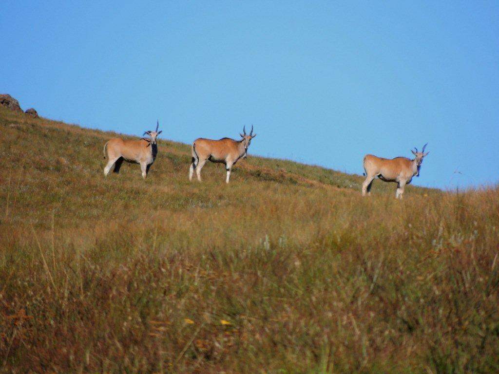 An uninterrupted view from Giant s Castle to Monk s Cowl just seemed to make the berg seem that smaller. A sprinkling of antelope grazed around us, and just up the hill, 4 Eland were happy to lie and wait for us to get closer before ambling across the skyline into the next valley. Very noticeable were the dark brown strips of treated grass called tracer lines that were prepared for the annual burning of the winter veld firebreaks. Burning long , large strips of veld grass prior to the onset of winter helps to control possible run away veld fires in the winter.