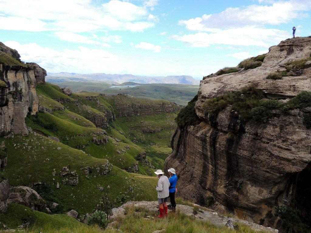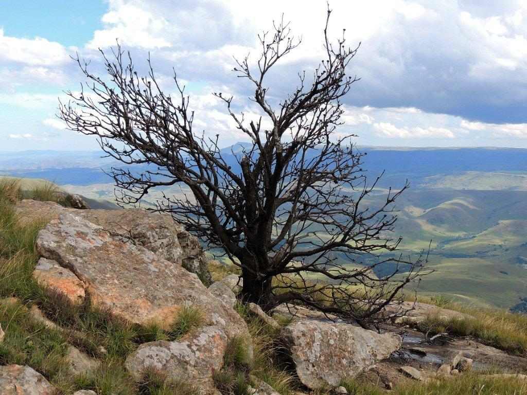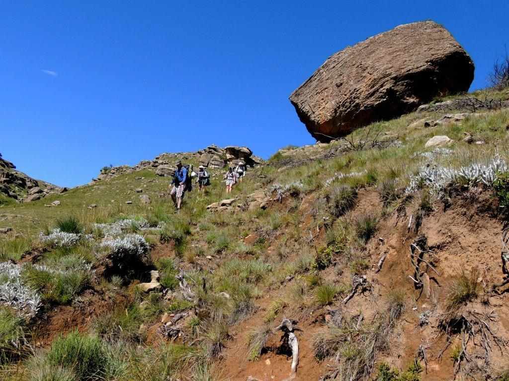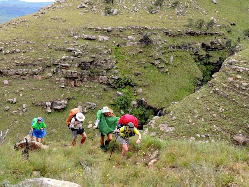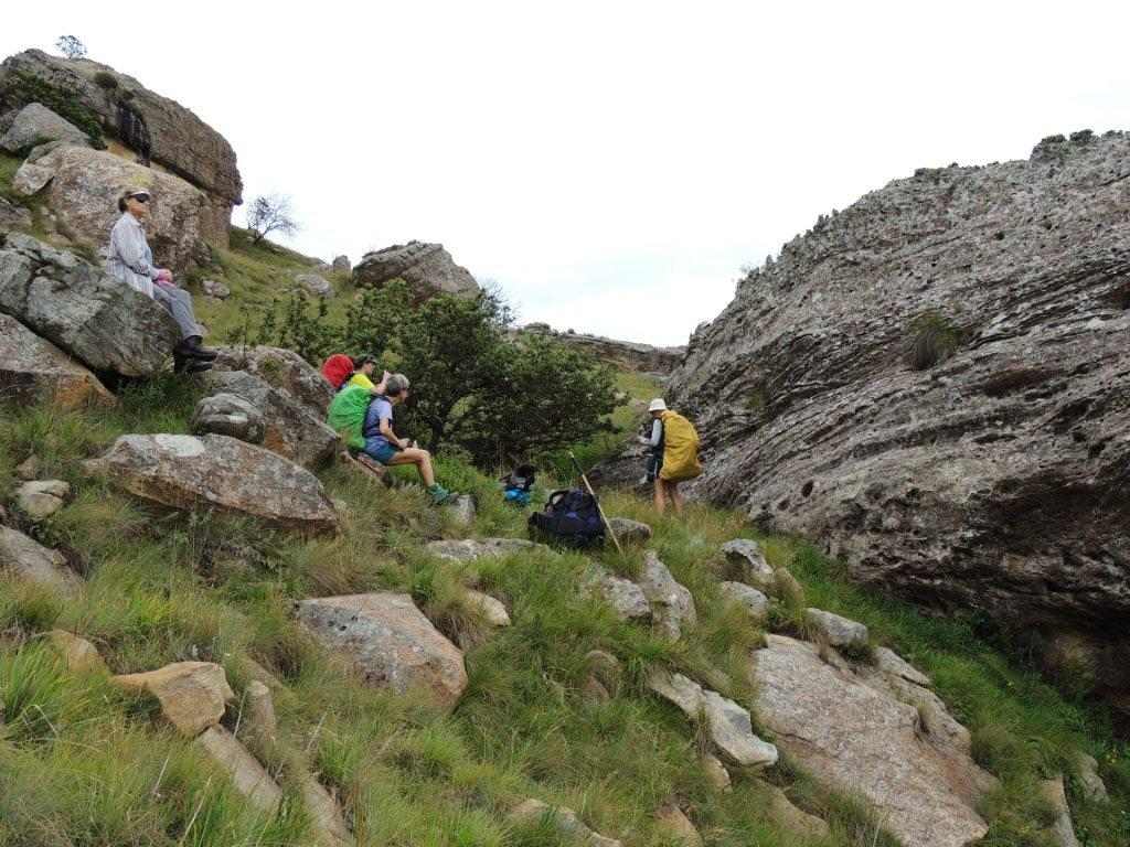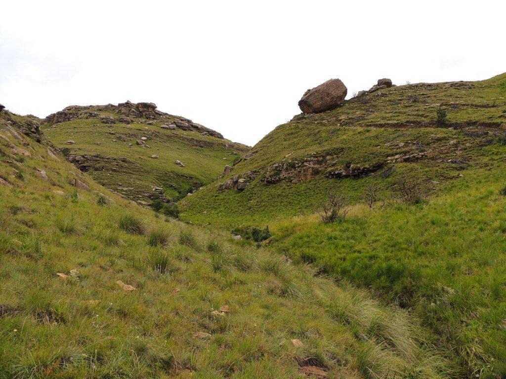 As the weather had started to look more threatening as we climbed, we decided not to have lunch on the way up, but to push through up and over the ridge, straight down to the cave in the next valley. On reaching the top, a rest break was needed, now we could see southwards for as far as one could see. The rain clouds had lifted, and to our right the high berg points of Lotheni were clearly visible Reddie Peak, The Tent and The Hawk.