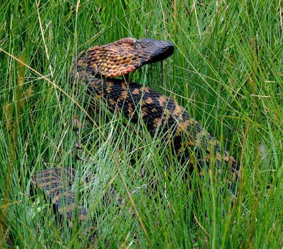 We now headed off down to the cave.( On the 25 January 2004, I had hiked this same route, and as we dropped down to the valley bottom , had stood on , and disturbed a rather large Cobra. I was wondering if the Cobra was a territorial animal, and MIGHT???? still be around. When we got to the area of my last year s incident, I walked carefully looking into the grass, suddenly Tish gave a gasp , and when I looked around at her, she said a large cobra had reared up out of the grass not far from her. Advanced towards her with its hood open, then dropped down into the grass and disappeared. Maybe they are territorial?