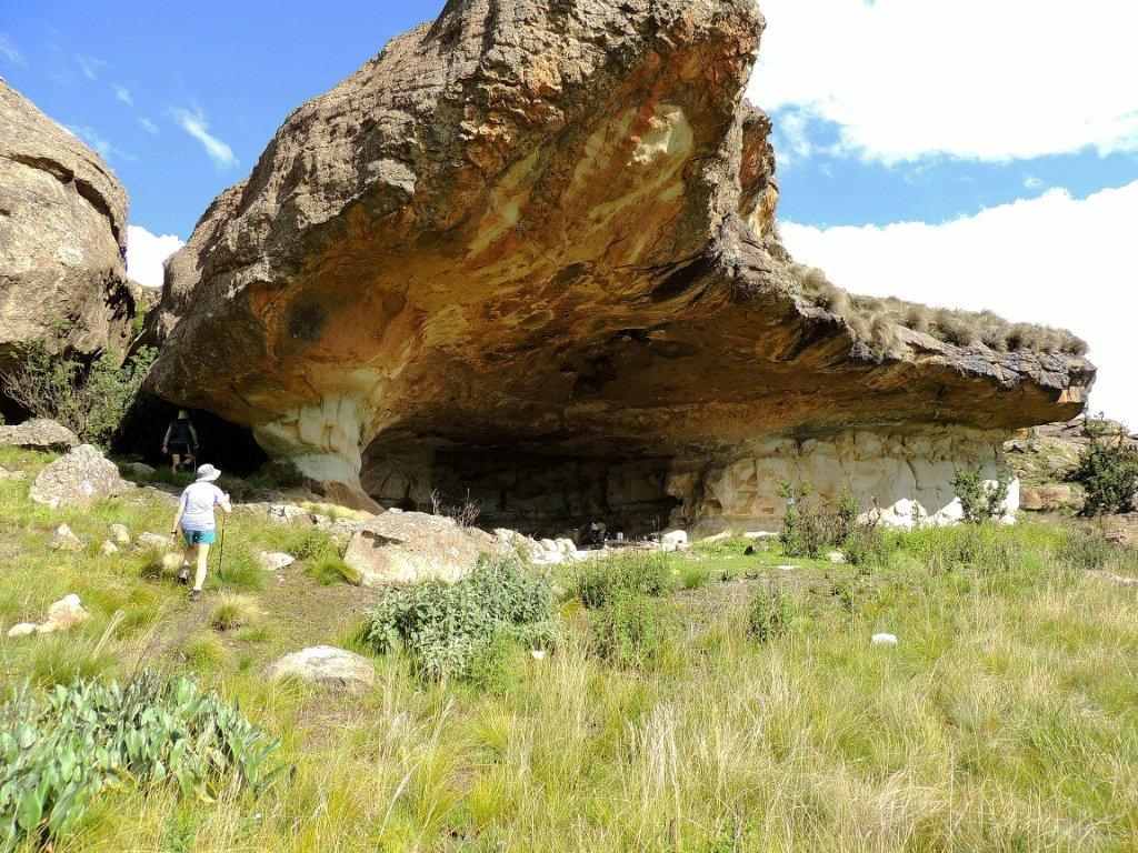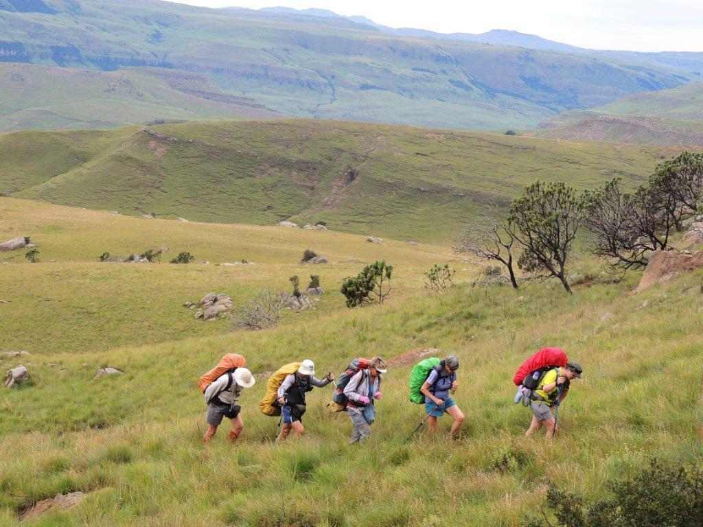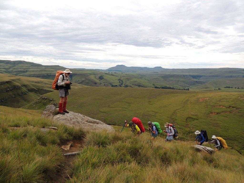 Eight of us met at the uMkhomazi office at 08h30 on Saturday morning to take the long steep uphill climb to McKenzie s cave for the week end. The reason for the late start was that the weather forecast had shown drizzle from about 11hoo onwards, so whether we rushed or not we would get wet. The morning remained cool, overcast with a few light drops of rain, ideal walking conditions. A patch of bright purple pampas grass stood out against the browning grasses of the berg side. McKenzie s cave is on the other side of the highest ride in the area, so it is a long uphill trek that never seems to end, and worse still, getting steeper towards the end. On the way, a large herd of eland were seen in the distance. The scenery of the surrounding area is very picturesque, if one takes time to rest and enjoy the view.