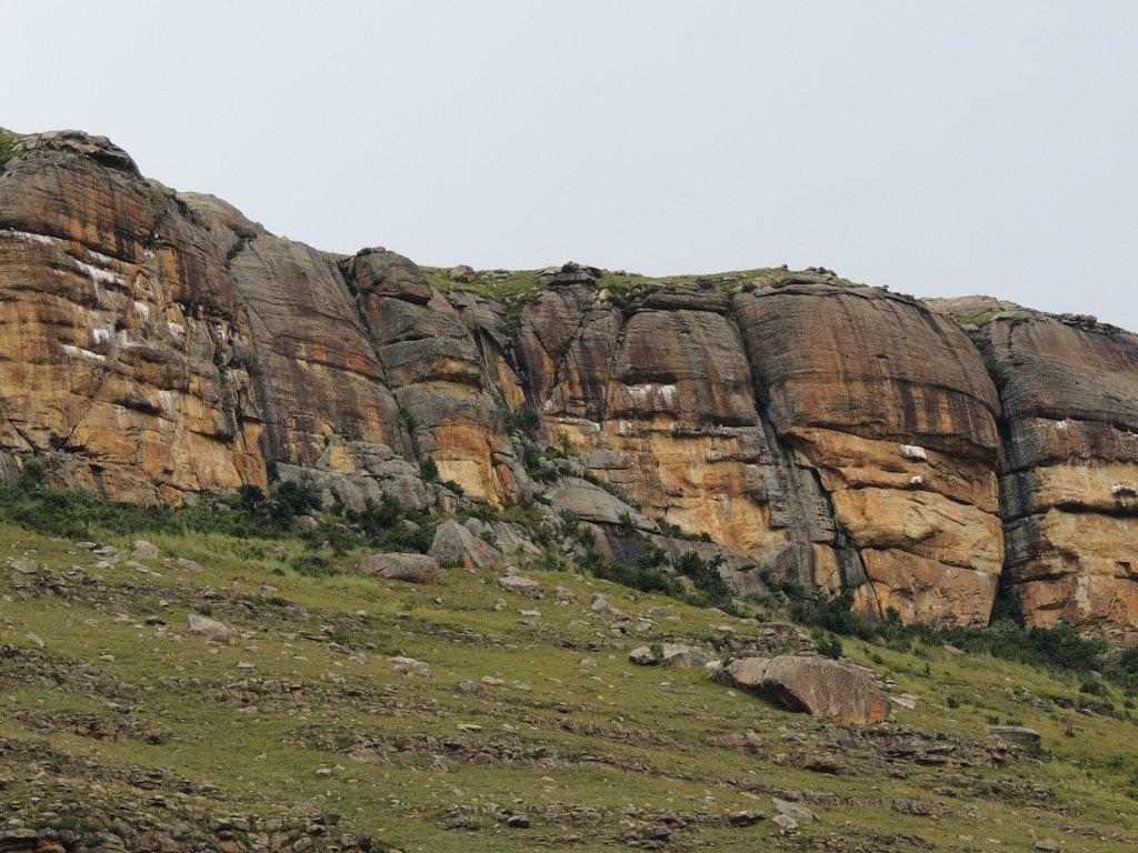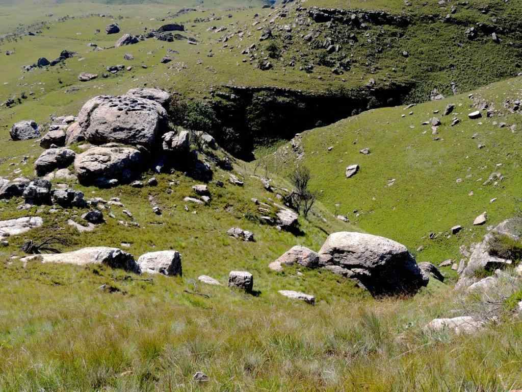 It must be explained that the McKenzie s cave is situated on a very high , steep sided ridge. All around are incredible views looking into the valleys far below, great, sharp steep cliffs race their way to the flat valley far below. The Lotheni road snakes and winds its way round the base of the cliff run outs , on its way to Lotheni , Vergeleegen and ultimately to Sani Pass. To the west, Lotheni Nature Reserve is the main valley into which we are looking into, with the high Lotheni range behind. From our vantage point we could see the heavy rain sheets beating down on the Lotheni area, moving towards us, then retreating back into the high mountains. So we were blessed with great views, and a promise of a great afternoon.