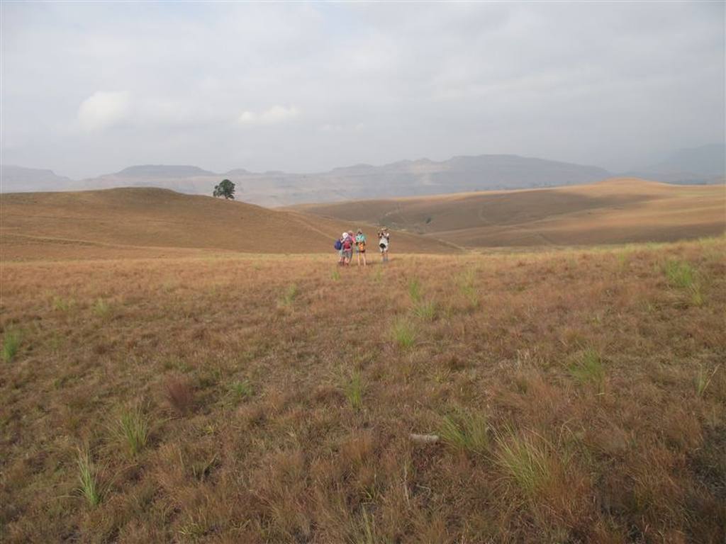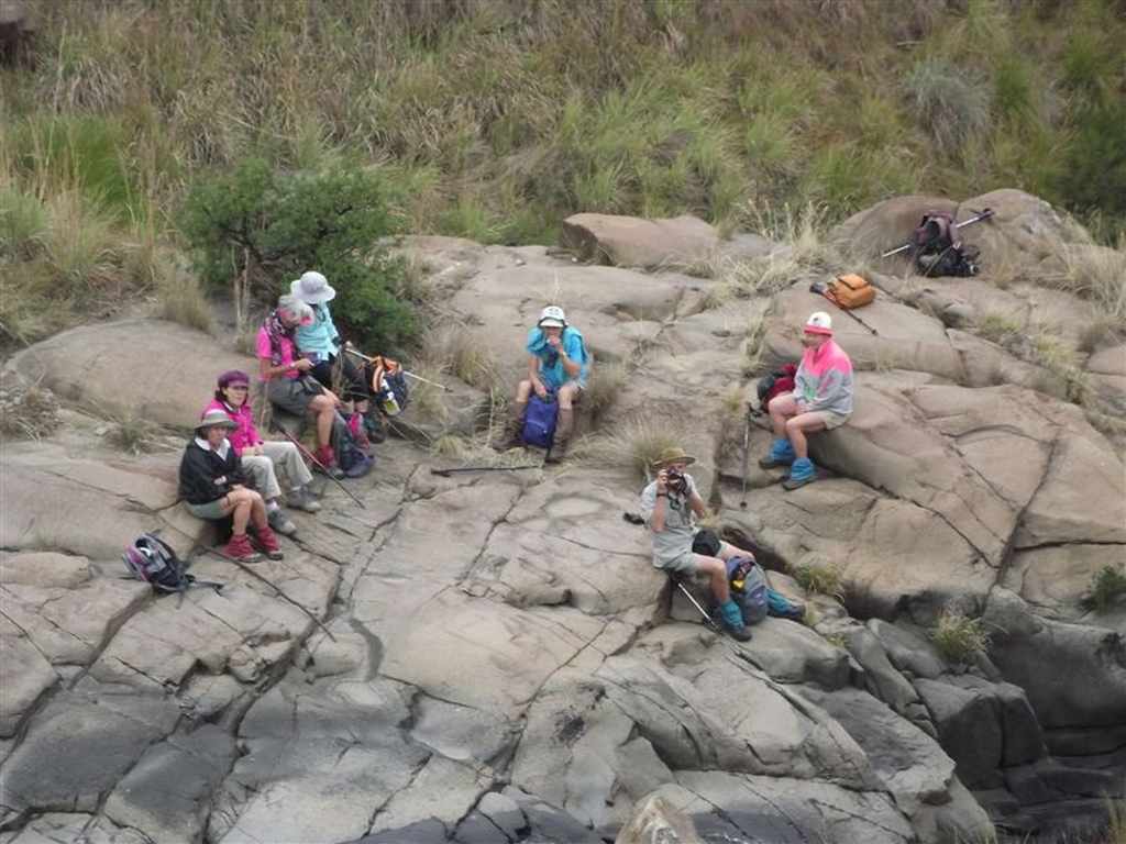 Our last full day hike was new to most of us as we started from behind the cottage and went straight up the rocky, golden-grassed hillside, clambering up to the rockband, and then following a gentle contour to the left where we overlooked KZN office, Swiman Hut and the beautiful campsite .
