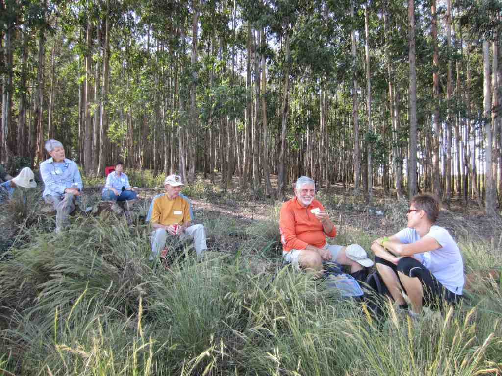 Our halfway snack stop was under some gum trees overlooking a small dam. On the other side was John Fowler' s farm with irrigated green pastures and its yellow soya bean crop rising gently from the dam. Refreshed, we moved on past the new Castle View development with its views across to Amber Valley and Kwa Wula. We crossed the Hilton College road and took the dirt track past Callaho stud farm. As it was getting hot, we followed the single track cycle track that snaked and twisted through the forest, thankful for the deep shade and the quietness of the forest.