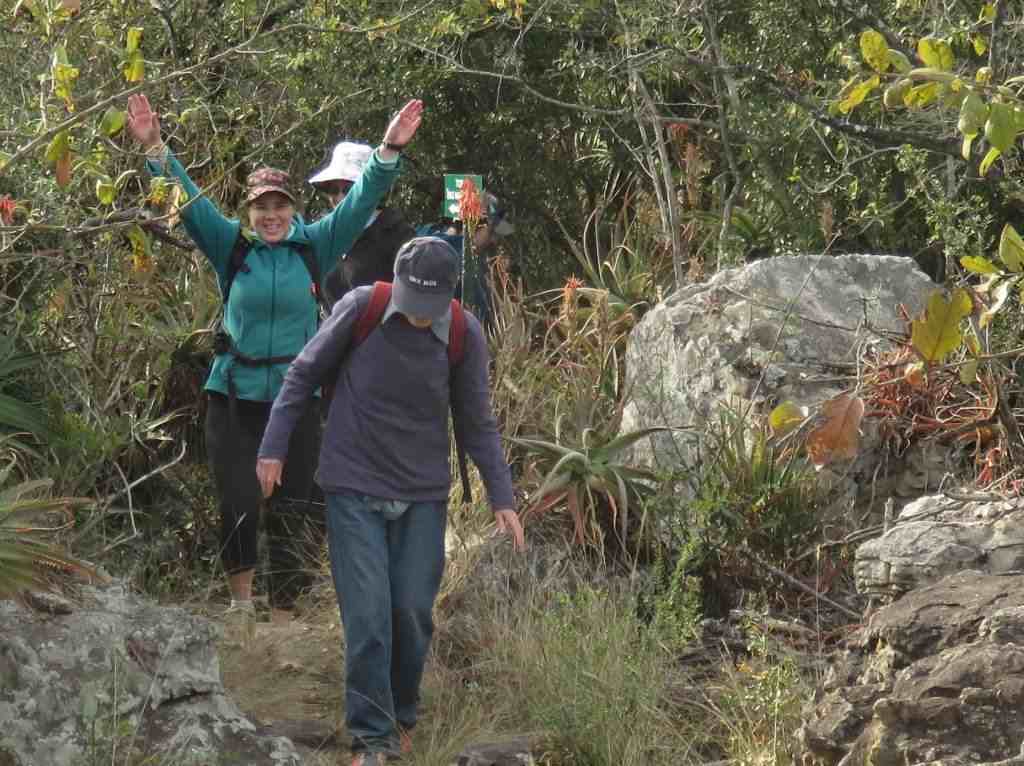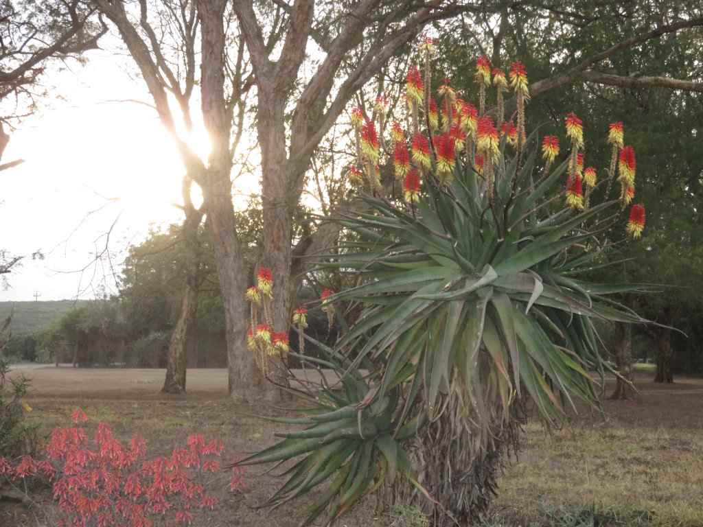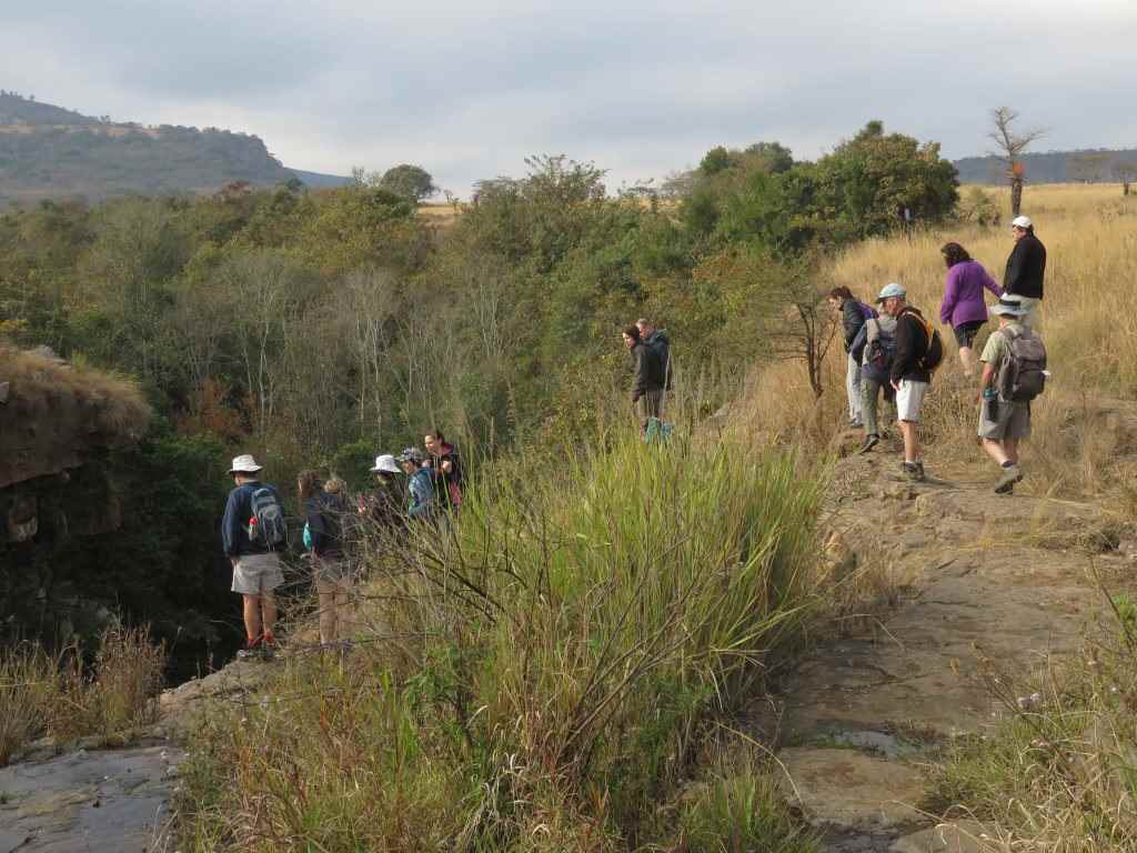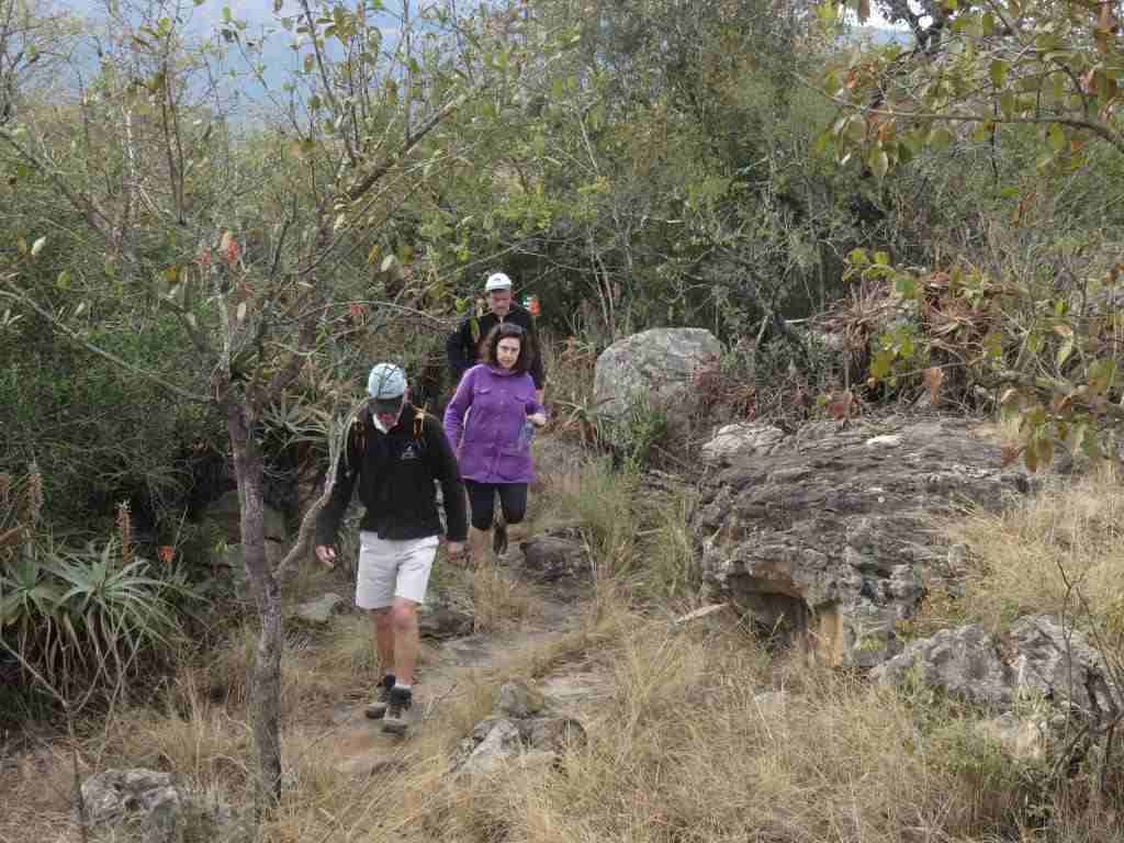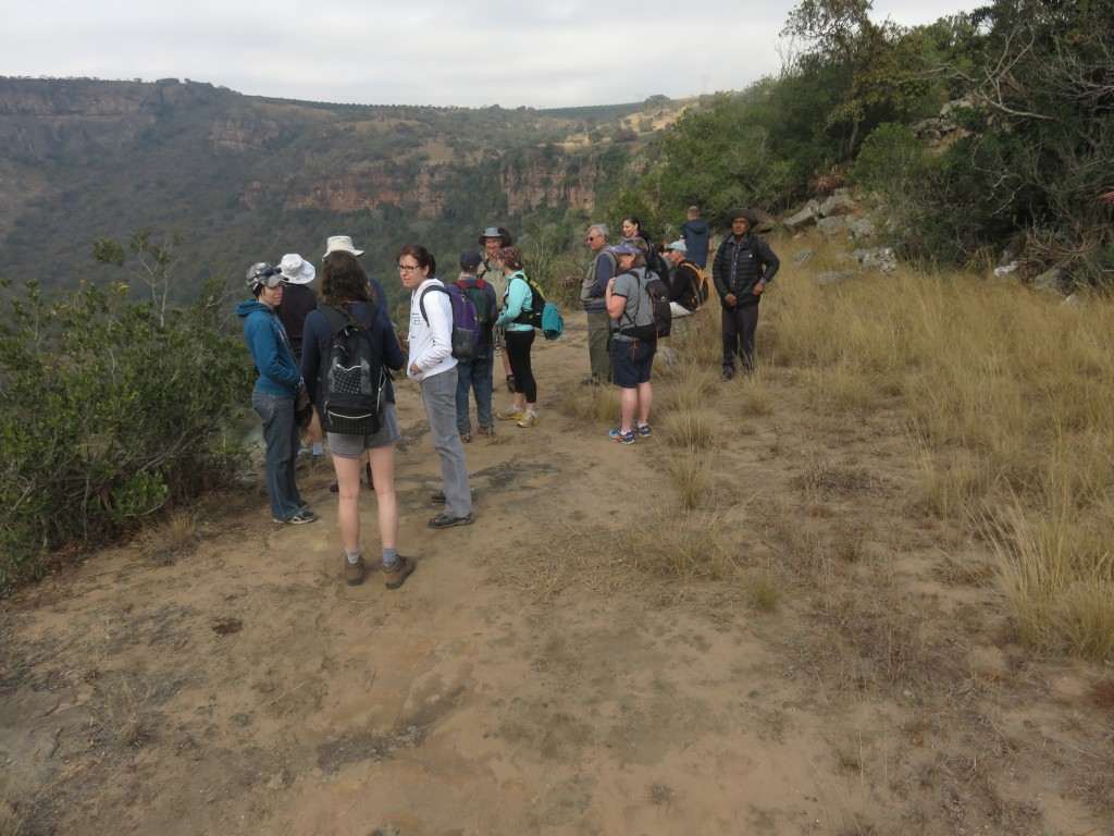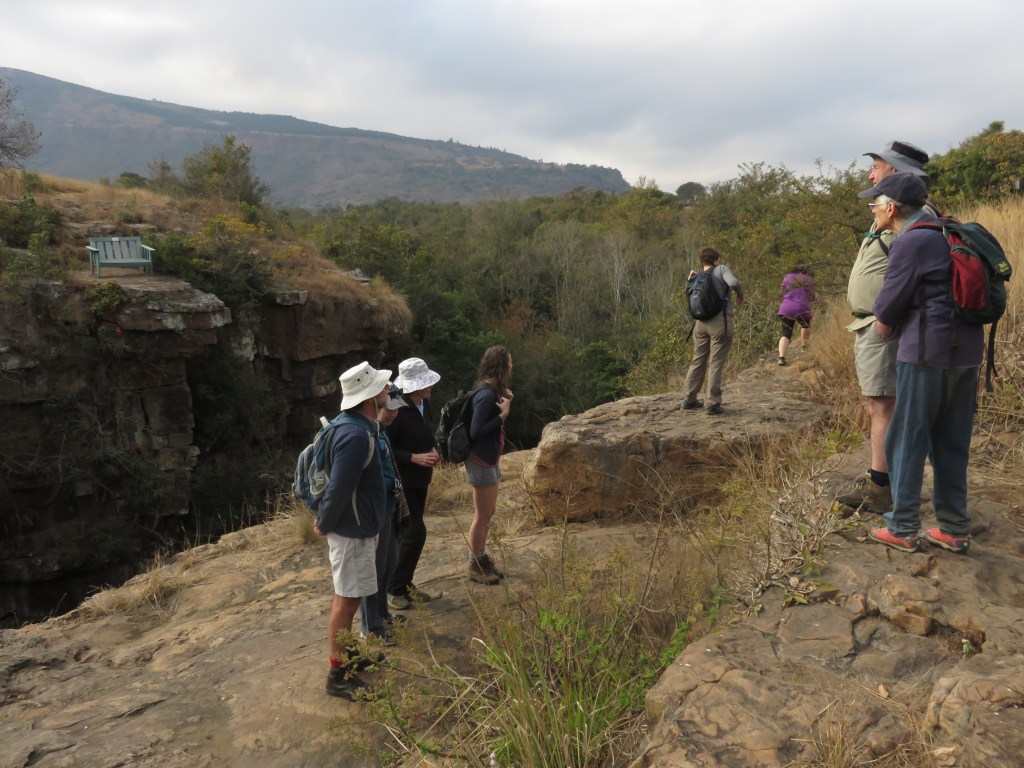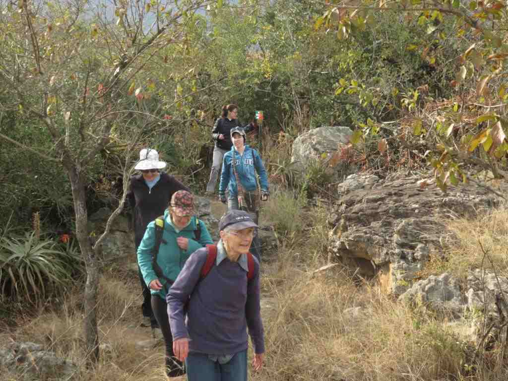 First stop just after the start is to view from the top, the falls (unfortunately without water at this time of year). All along the way there is a colourful assortment of aloes. A short diversion branching off to a ledge for a better vantage point of the falls gives me, the photographer the opportunity to photograph most of the group in turn as they reemerge (photos 11-14). A short rest (photo 15) after the exertion of the climb back up and then we are off again to the next viewpoint.