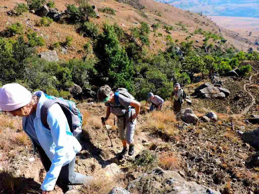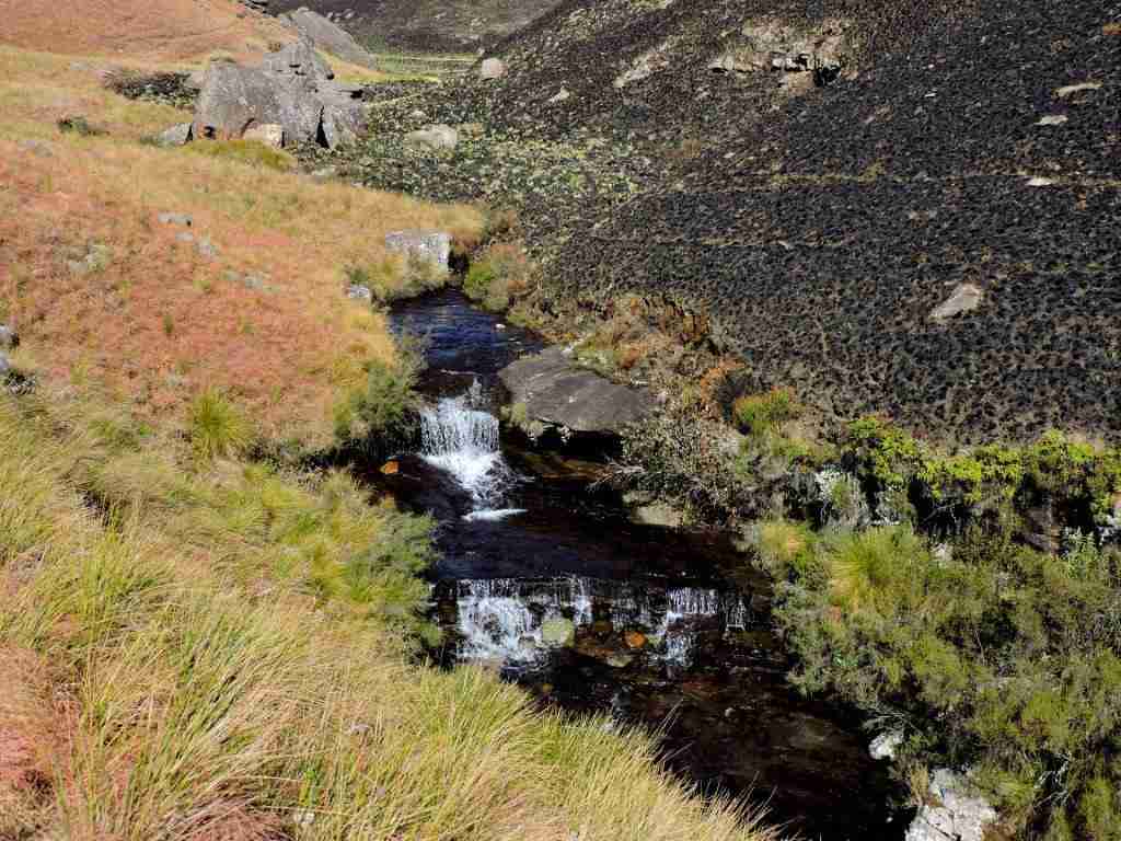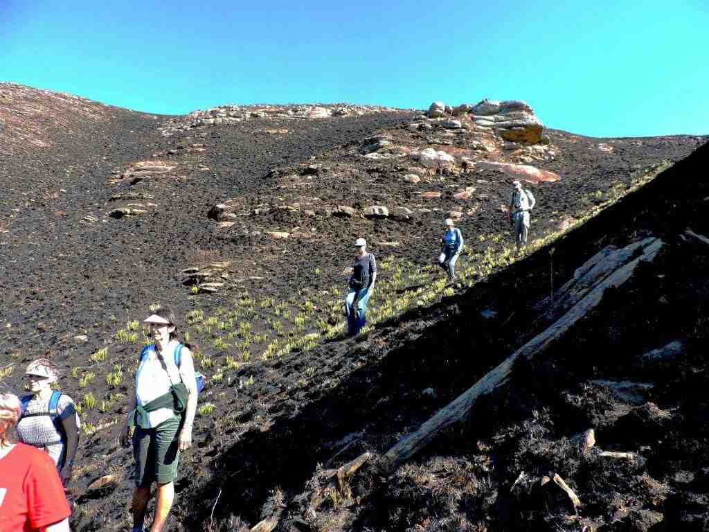 We now had a steep climb to get to the summit of the valley. Here again we were fortunate, that with the burning of the grass we could find easy footholds amongst the loose rocks to have a fairly easy climb.