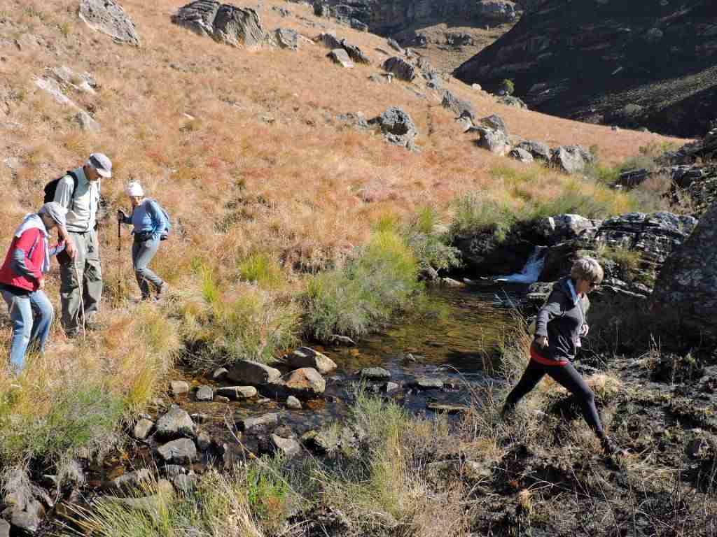 Seven of us met on a cool, clear cold morning at the Kamberg office, and after the formalities were done, we set off towards famous Game Pass Shelter Cave with it' s incredible paintings. A short rest at Emewen Qwabathwa Falls, then we headed left up into the steep valleys that dominate the region above the cliffs that look down on the Kamberg camp. High to our right across the stream, the high cliffs that house the famous paintings looked down on us.The streams were still running well, and much to our delight, we found ourselves in an area that had experienced a runaway fire, and a huge area had been burnt. We had expected to fight our way through long spiky riverine vegetation that would have made the going difficult and treacherous, now it was literally a walk in the park, as were able to negotiate easy walking over the steep valley bottoms. Further up the valley we stopped for a water break before we started the big climb up to some rock shelters high above us.