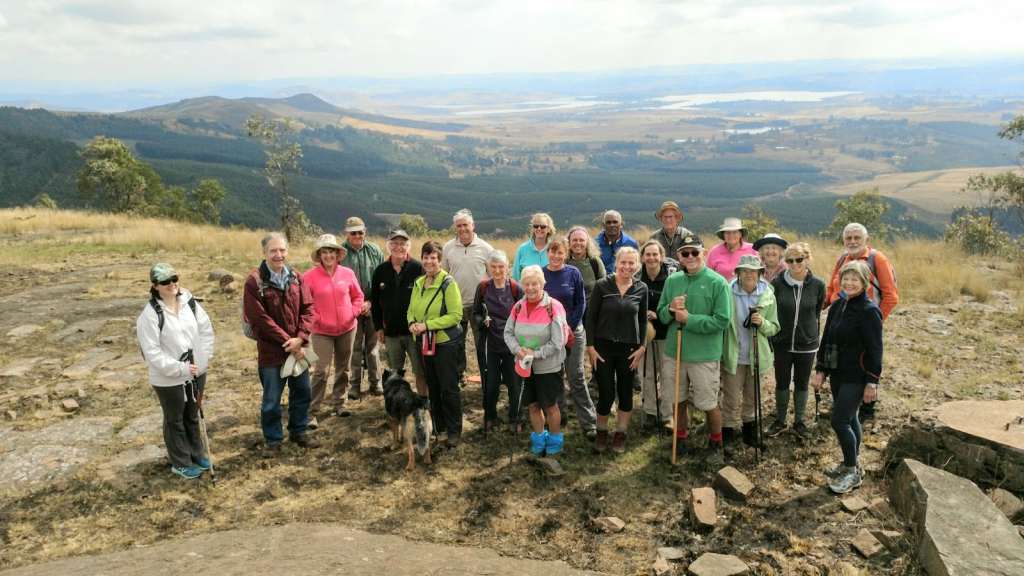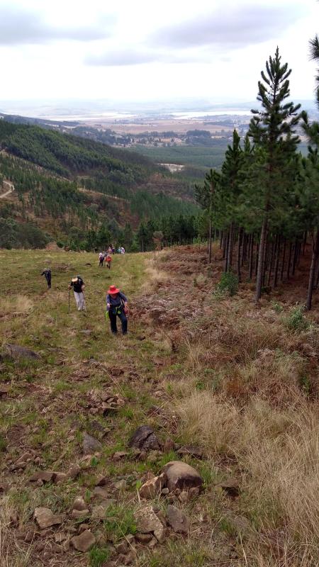 All hikers met at the Cedara entrance and travelled to the Cedara lecture theatres. (Cathy Nixon, because she used to work at Cedara, was able to get us permission to hike through the farm.) The first hour is a delightful hike along the farm roads, through fields and alongside the largest dam on the property. From this vantage point one can see the route to the top. After the dam, the route finds its way along forest plantation roads, the playground of hikers, cyclists and motorbike enthusiasts.