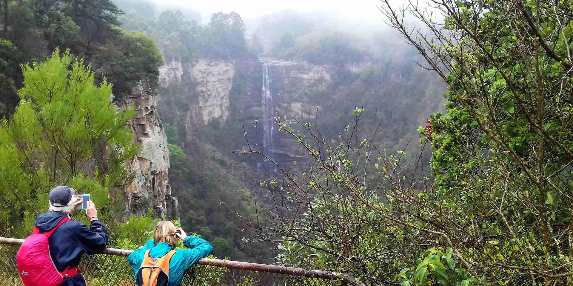 There were several newcomers on this hike. New member, Ruth Armitage, her daughter Hannah, and friend Jo Parsons. We also welcomed new members Hazel Buchanan, and Dave and Carol Brammage. There was a mixed group of young and old on the hike. It was a windy route, twisty and turny. There were narrow forest paths and broad tracks but wet everywhere, the drizzle sometimes thick, sometimes soft, and sometimes it stopped. We were fairly sheltered in the forest. We suddenly came to a clearing, I think to Brian's surprize, and there was the viewpoint of the Karkloof Falls. A photo shoot took place. We chatted to other visitors, from India. Then we were off again, up a steep bank with the ever optimistic Brian leading us (astray).