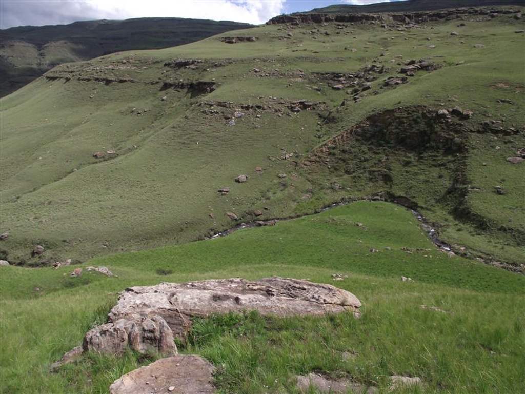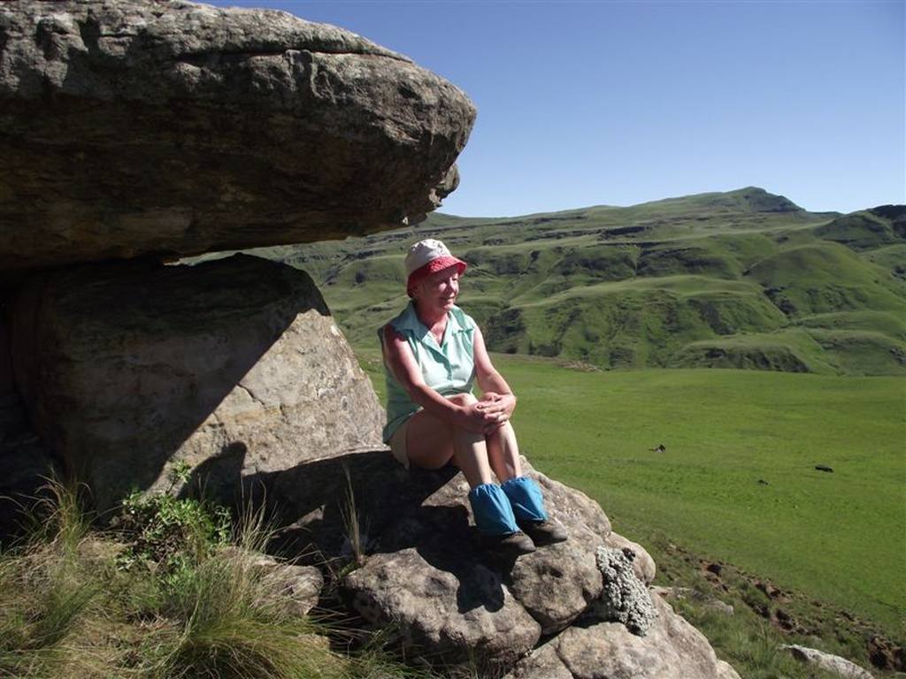 Further along we branch right off the main track (which eventually leads towards Tarn Cave and Sehlabathebe) as we took a quite indistinct route towards "The Gap", first having to cross a small stream which some of us managed to cross without removing boots but for others it was boots off again - we all refilled our water bottles.Then its the climb up to "The Gap" which gets us quite hot again in the full sun and heat, but soon we have a bit of a rest at "The Gap" to take in the scenery and look across the valley where we can spot Vast Cave. But first we continue on our route to Mystery Cave along a roughish indistinct track with a few ups and downs along the side of a beautiful valley with a lovely stream with pools below. After a while we reach Mystery Cave with its welcome shade and very good interesting Bushmans Paintings - its relaxation and time for lunch.After lunch some of the ladies (namely Margaret A, Linda and Katy had a partial or full skinny dip in the stream below the cave.