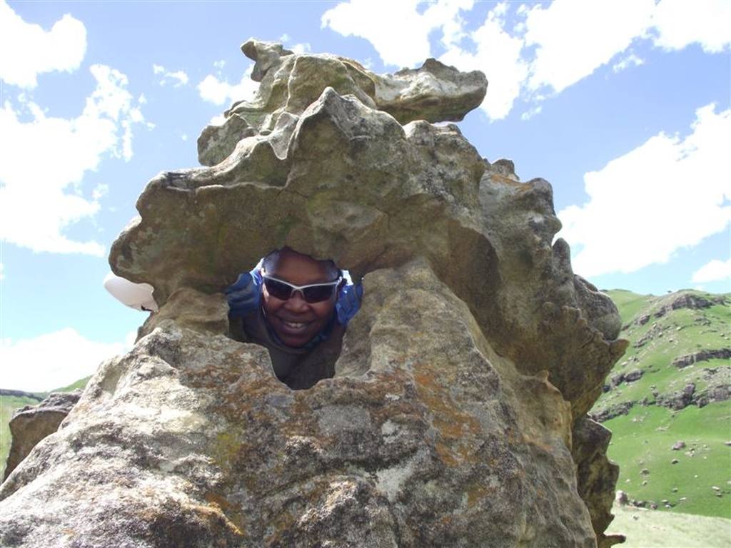 20. Zanele under balancing rock, on our way to Thamathu Cave