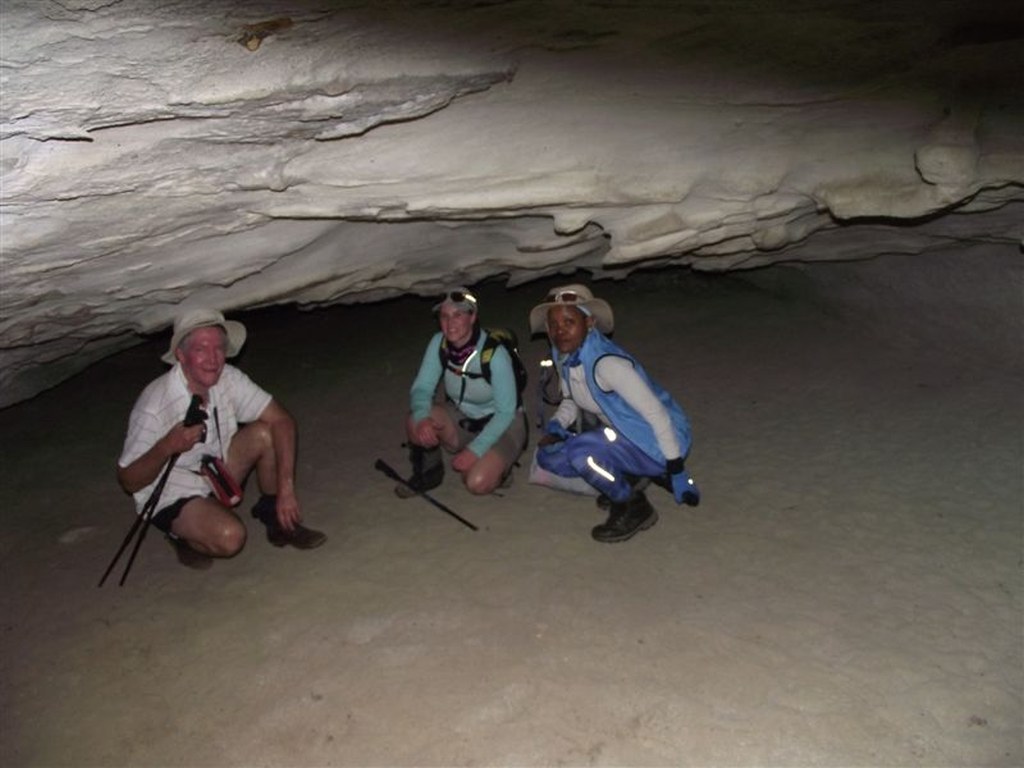 Only Zanele, Katy and Eric joined me for the Vast Cave option so up we went whilst the others had a break. It was still a very hot climb to the cave and we were happy to find shade inside the relatively cool cave. Having been in bright sunlight it seems very dark in the cave which stretches about 50 metres into the mountain (hence the name "Vast"). On reaching the far end of the cave I took some flash photos of Zanele, Katy and Eric crouched in the darkness.