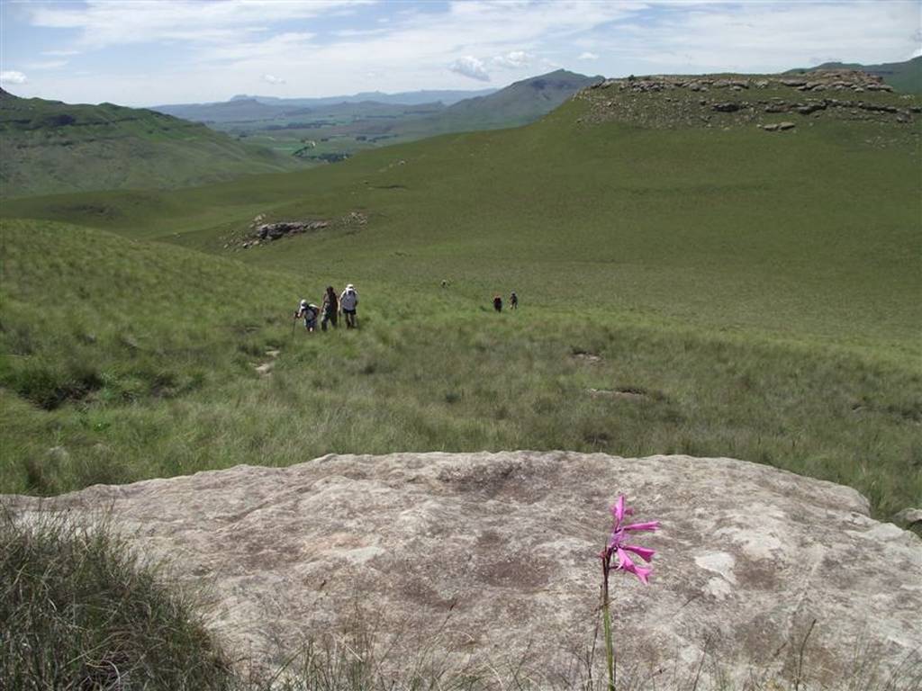 The route to Painters cave is virtually all uphill with very few level areas and our first rest to take in the beautiful views towards the Devils Knuckles and Thaba Ngwangwe was near some flat rocks and a big cairn - we had already travelled past many different wild flowers with blooms covering the colours of a rainbow, but eyes have to be kept mostly on the ground or tripping-up is inevitable.