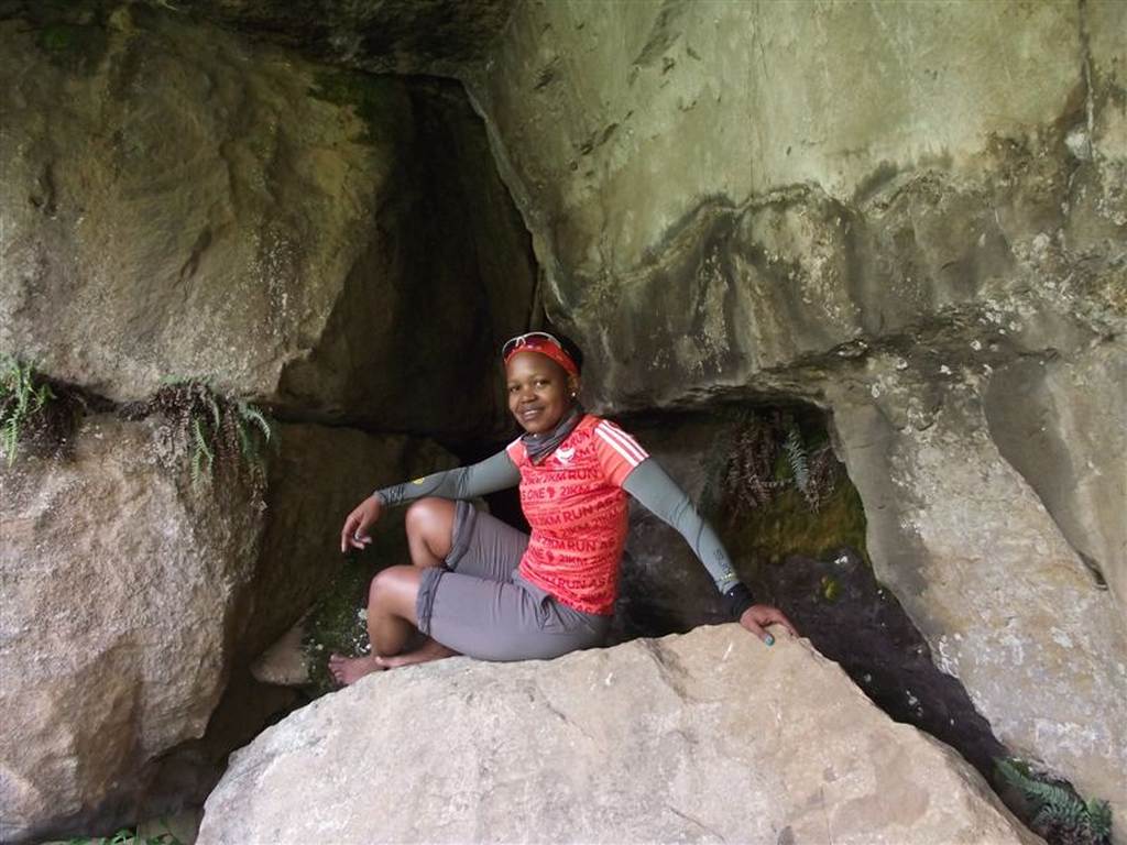 25. Zanele sitting near one of the sleeping spots at Thamatu Cave