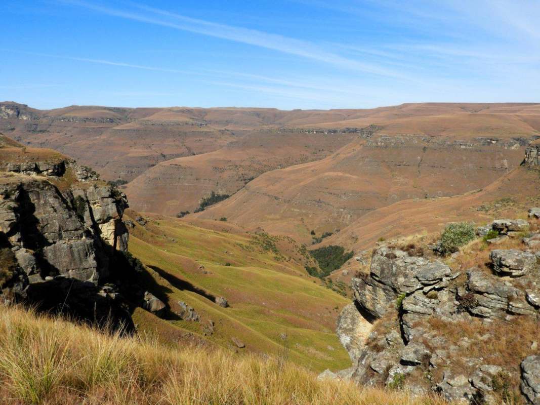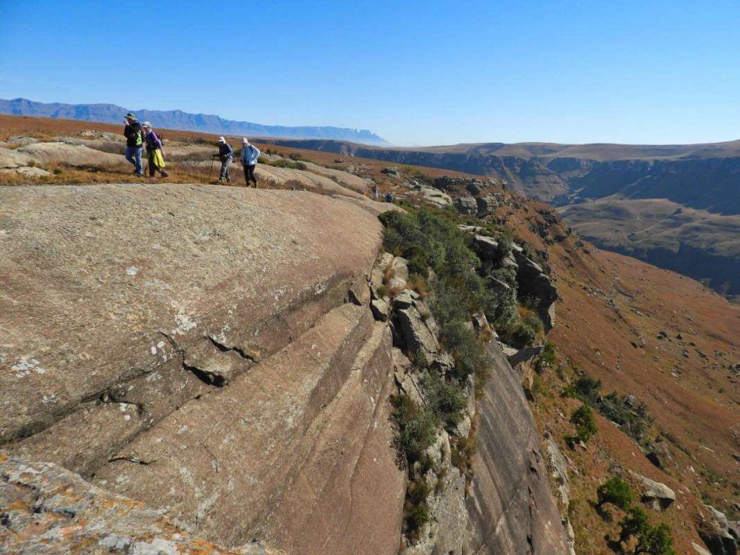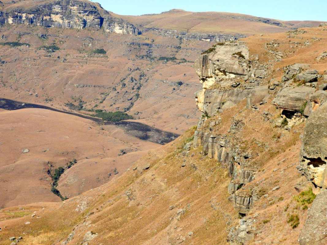 We kept walking in an easterly direction towards the end of the Highmoor escarpment to the high cliff formation known as Cleopatra. The are very few paths or roads in this area, so most of our walking was done over the rough ground. However the going was fairly easy, and the pace was one for looking at the amazing views above and below us. The great valleys of Highmoor were all around us. Sooner than later we reached our destination, the top of the great cliffs that had supported Cleopatra for so long. The breathtaking views below us, dramatic and clear. To the east, the beautiful Kamberg Valley, with the majestic Kamberg Mountain to our right, to the north, the unmistakable Champagne Castle, Monk's Cowl, Cathkin Peak and Sterkhorn. The sky was clear and everything looked so near. As we stood looking into the valley, a lone vulture glided silently below us, later to be followed by a number of these incredible masters of the sky.