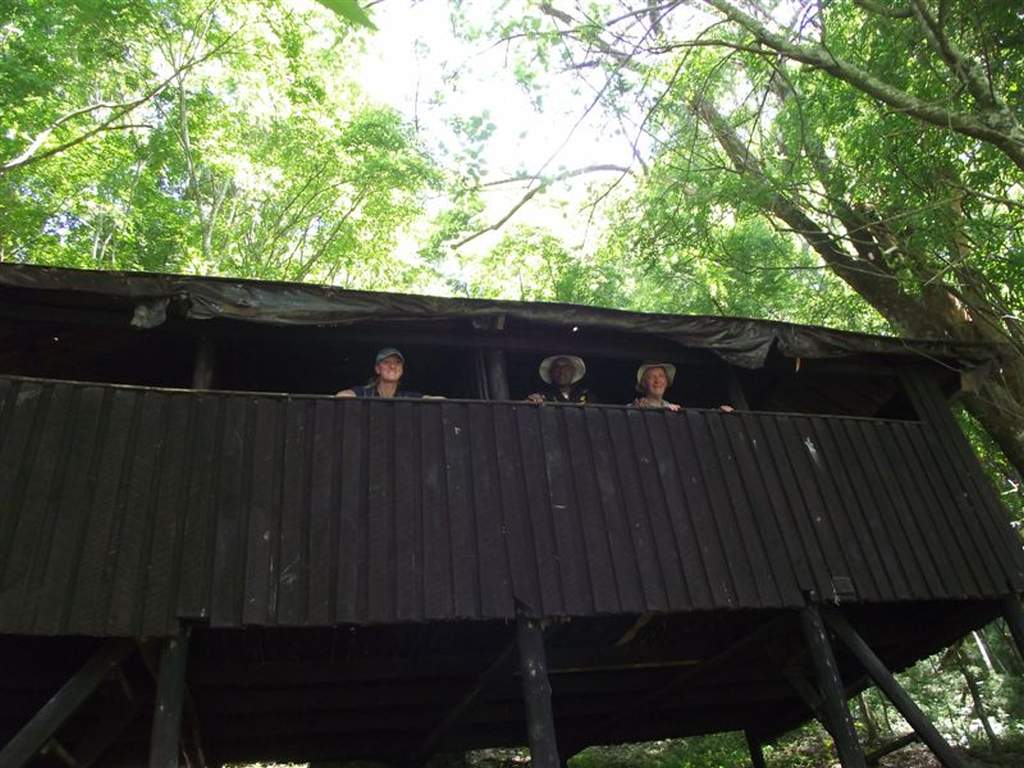7. Helga, Deon and Eric look out from one of the huts at Shelter Falls Camp