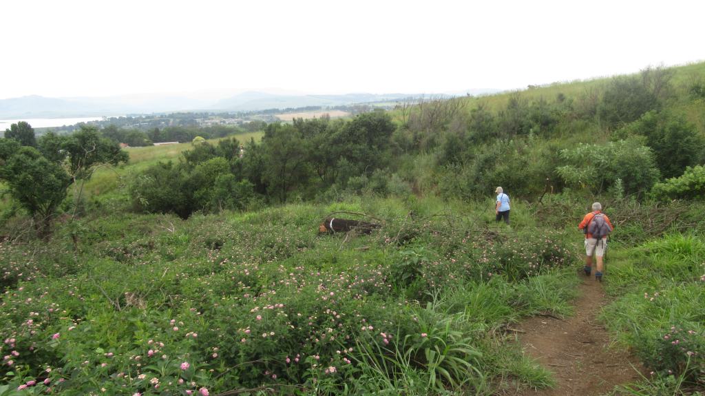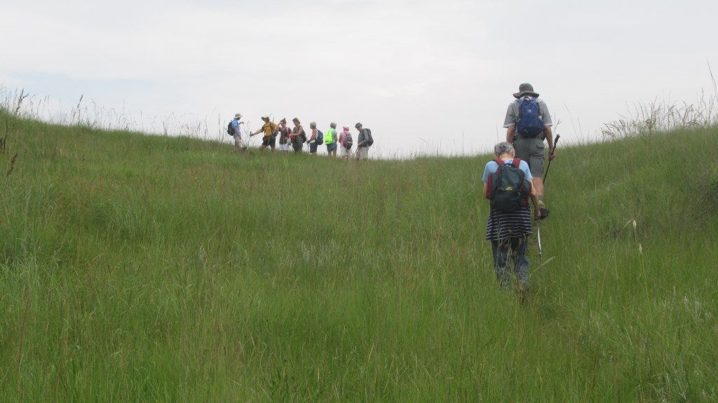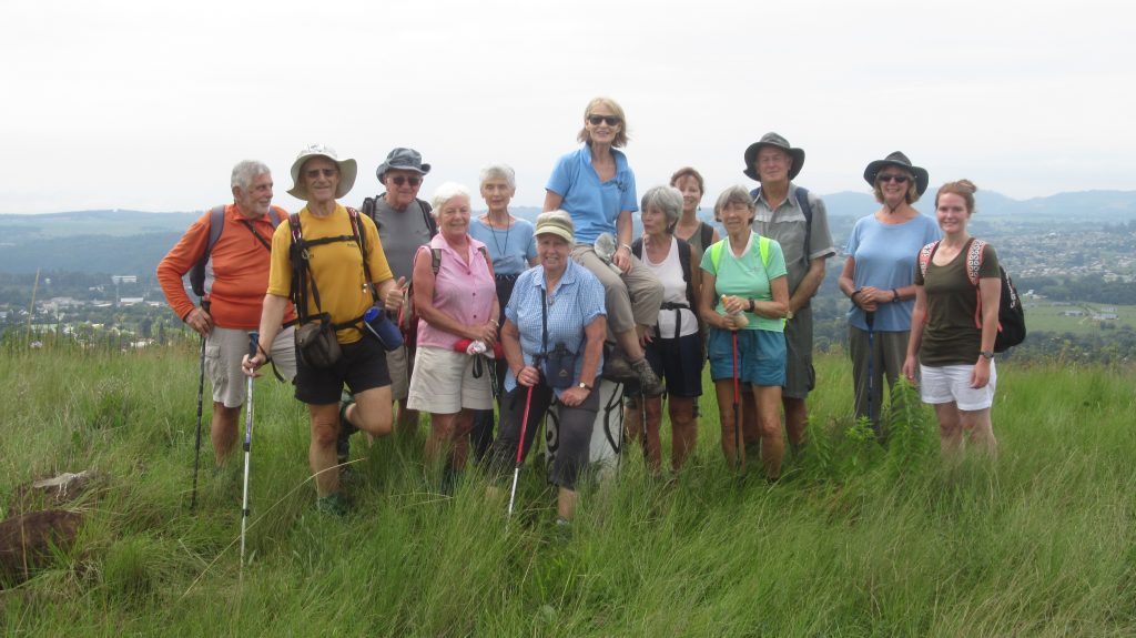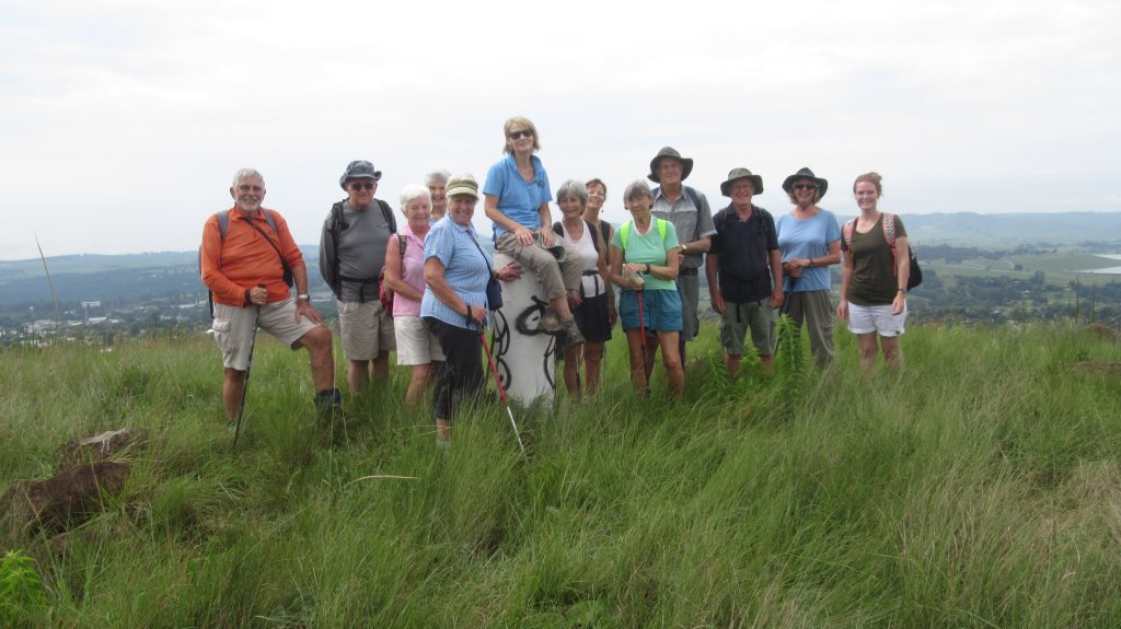 14 hikers, led by Carolee Thompson. Beacon Hill hike is an ideal way to view Howick from various vantage points. An eager group of 14 hiker set off from Eagle's Ridge club house. The first section is along the Currie's Post road and then picks up the path through grasslands towards the beacon. There are some excellent views of areas not always so obvious when driving into Howick. Midmar was looking full after welcome rains. Swartkop over in the distance along with a very distant hazy Nhlosane reminded us of other MHC hikes.
