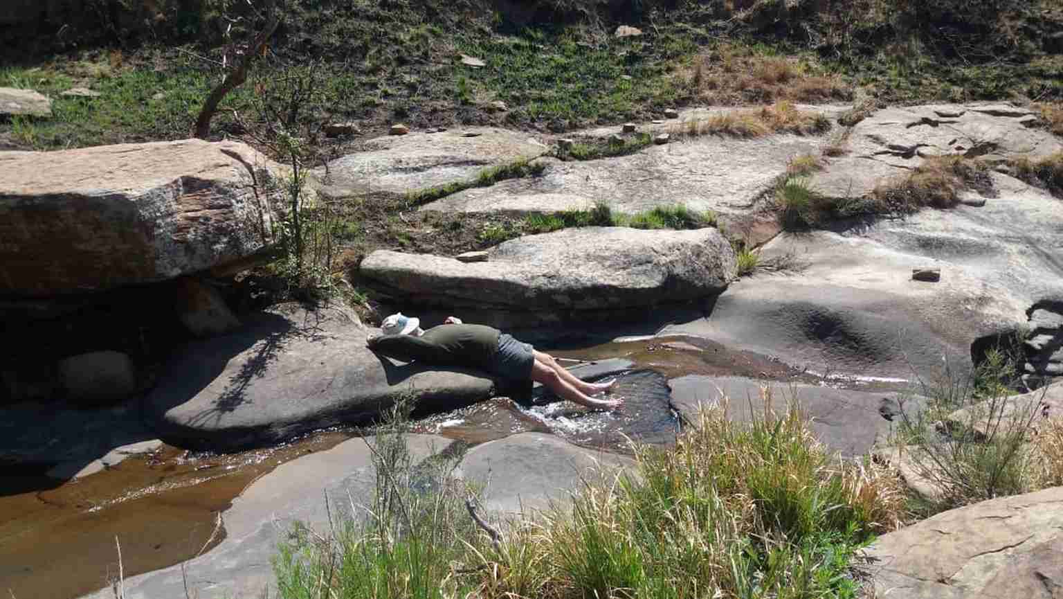 Once around the cut back, we headed again for the river valley edge to be able to look down into a very narrow deep river with many pools and rocky baths and adding a very noticeable change of scenery. On the other side of the river the grasslands had been burnt, and this burnt area was a shimmering blanket of fresh green grass that contrasted so vividly with our side of the river. Walking carefull along the steep slope, we followed old worn, hard to see animal paths. One had to take time to stop and have a scenic view chance now and then as, following this old track was an "eyes down on the path only", an intense walking operation.