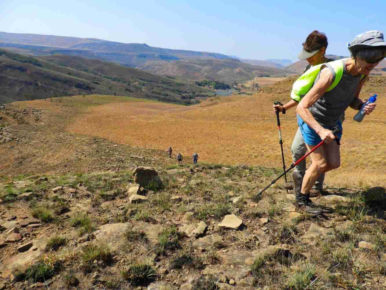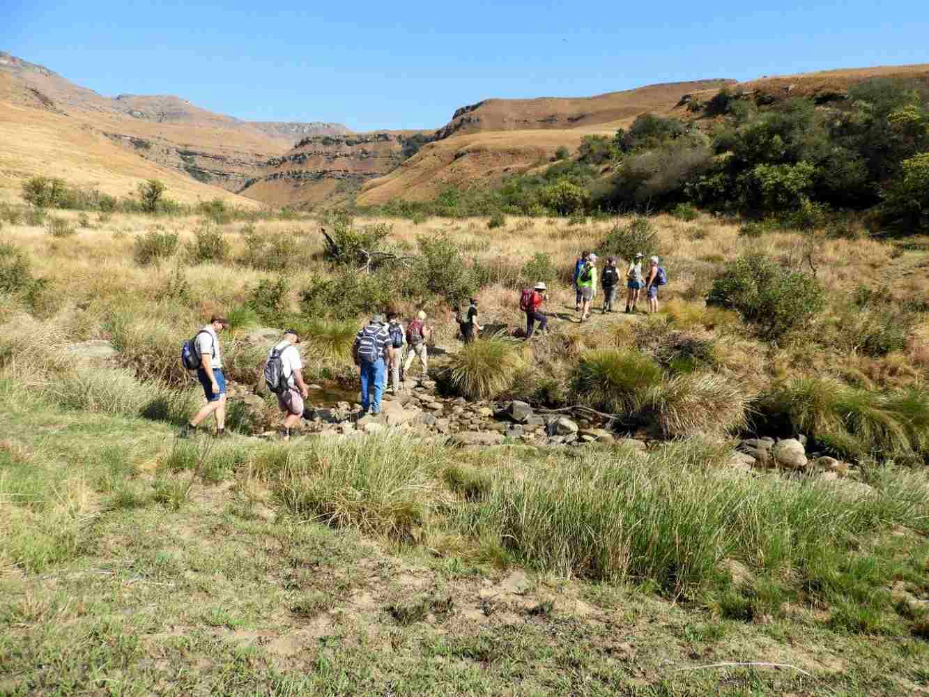 From the crossing it was then a long uphill pull, walking alongside and in the firebreak, which bordered on another river far below. Frequent rests were taken to check the view, and to catch our breath. As the cave, our destination for the day was not that far away, hard hiking was not necessary. Across the river, the steep high cliffs leading to the boundary edge of the Kamberg soaring above us gave spectacular views of deep kranzes and dense natural bush in the kranz valleys