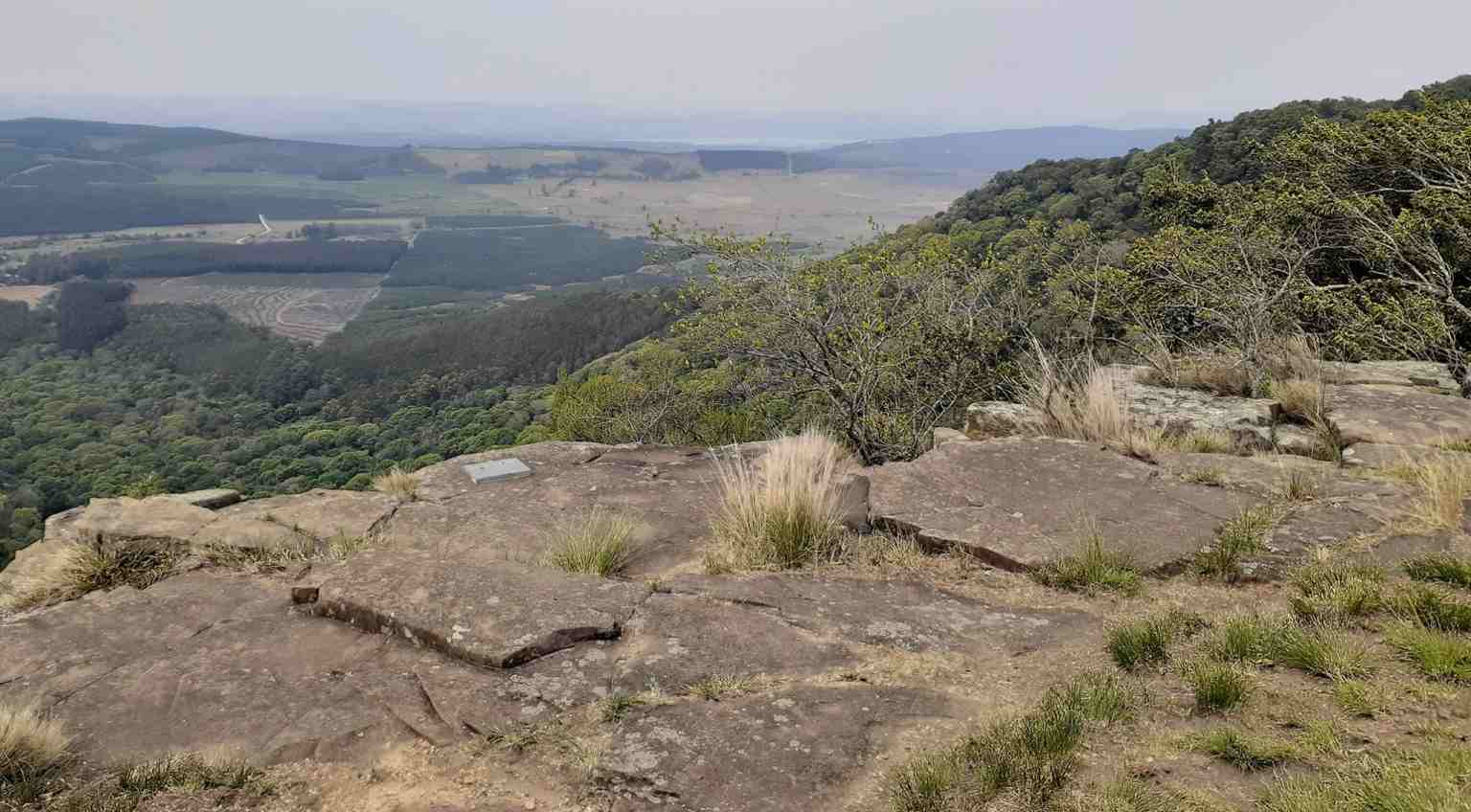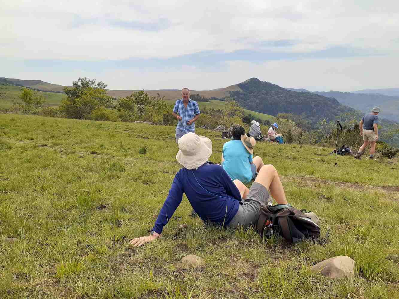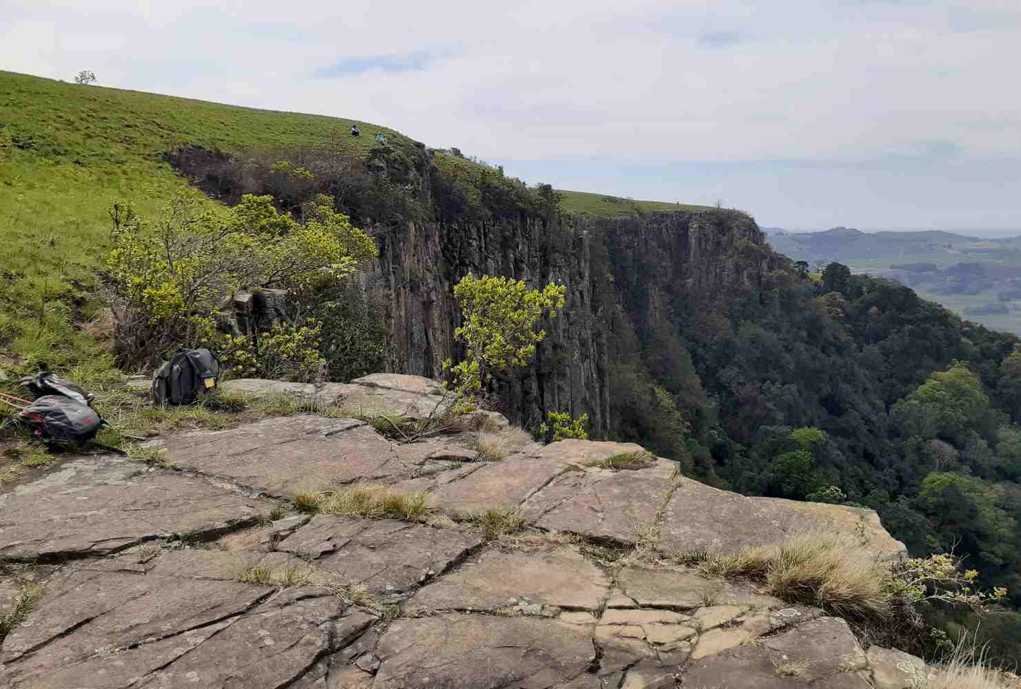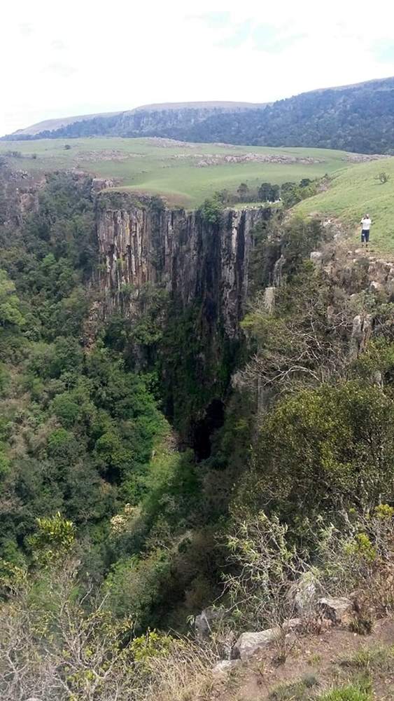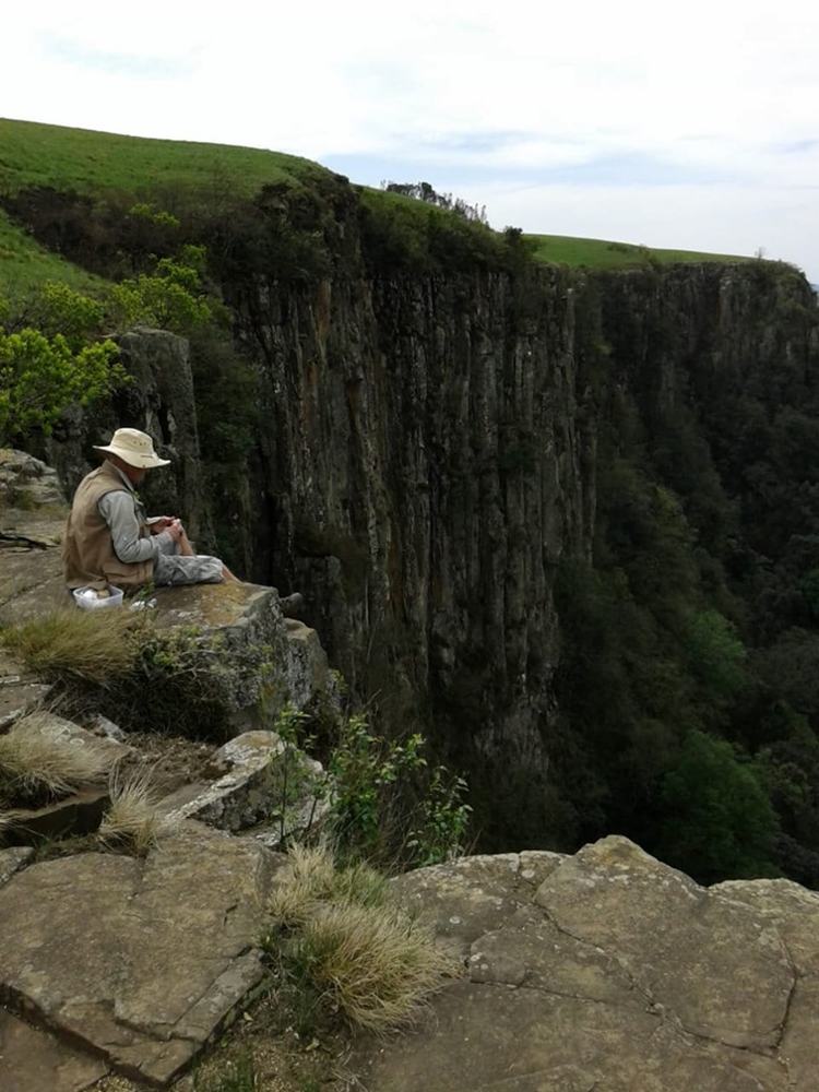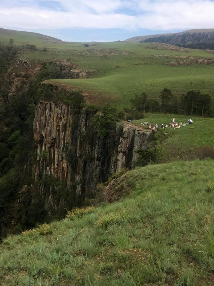 out onto the grassland with stunning views to behold - Karkloof below and Midmar Dam in the distance. A short walk to our lunch break at Grey Mare's Tail Waterfall (101 metres high and named by the Shaw ancestors after a waterfall in Scotland), the stream had very little water coming over but in peak rainy season, a different scenario with the falls moving constantly from one side to the other - just like the