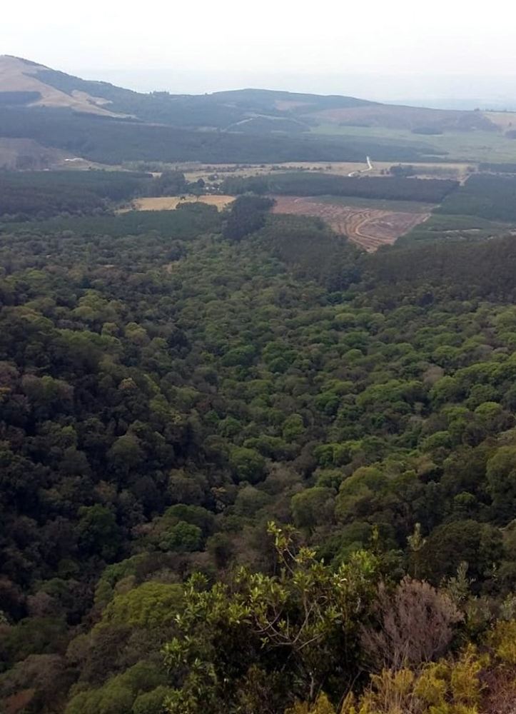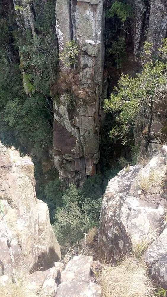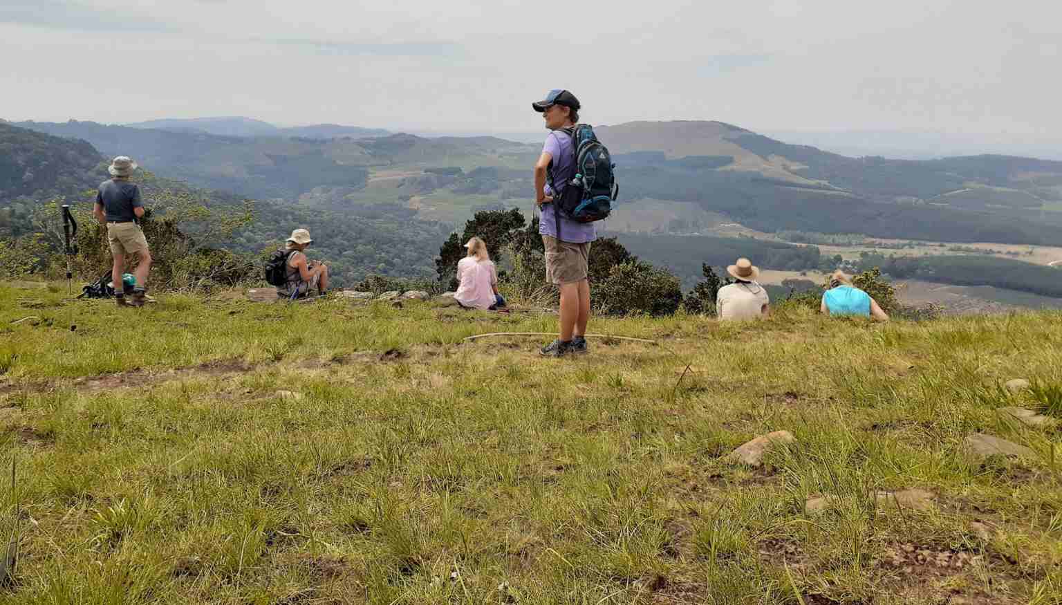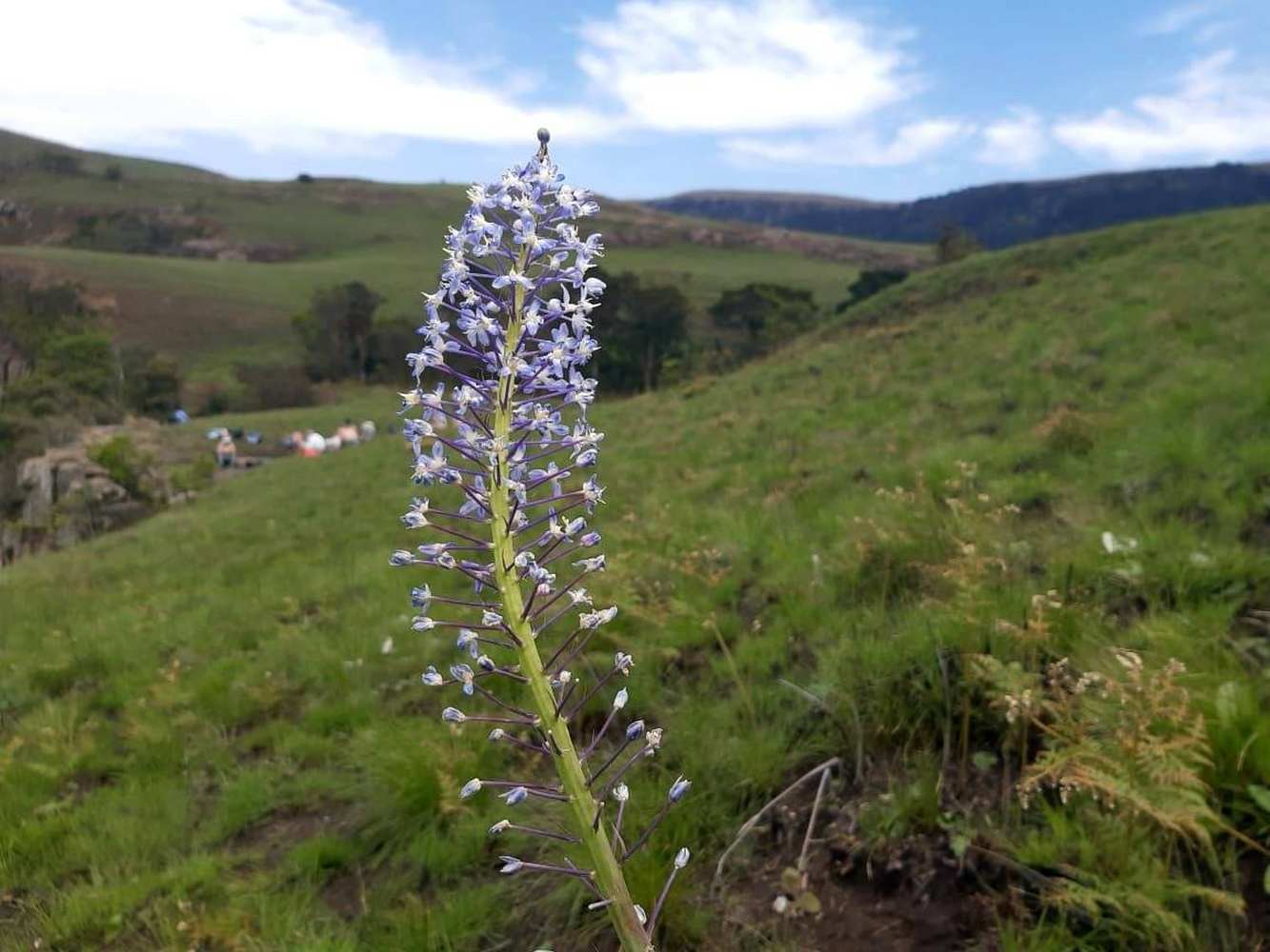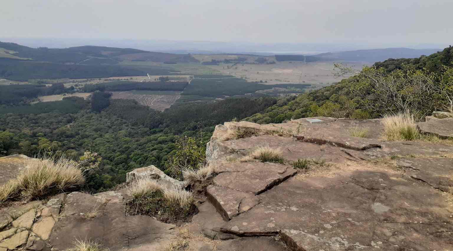 out onto the grassland with stunning views to behold - Karkloof below and Midmar Dam in the distance. A short walk to our lunch break at Grey Mare's Tail Waterfall (101 metres high and named by the Shaw ancestors after a waterfall in Scotland), the stream had very little water coming over but in peak rainy season, a different scenario with the falls moving constantly from one side to the other - just like the