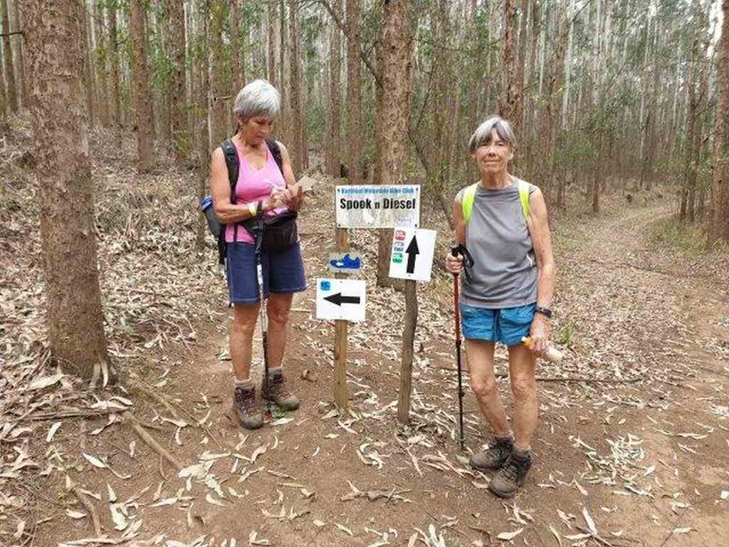 The group met at the Karkloof Country club at 8.30, where Sappi indemnity forms were signed and fees paid. The trail of 15 km was very well marked with signs at various junctions and amusing names - Booga-Loo, Spook n Diesel, Boom Slang, Soul Fly, Sappi Chappi, River Riviere, Digits Dive and the last one being Heaven. Part of the trail was a loop in the plantation on the other side of the Karkloof road and we had to pass through a tunnel under the road. We had lunch at the first picnic site at the falls and some members walked up to the second picnic site to look at the top of the falls.