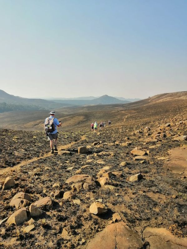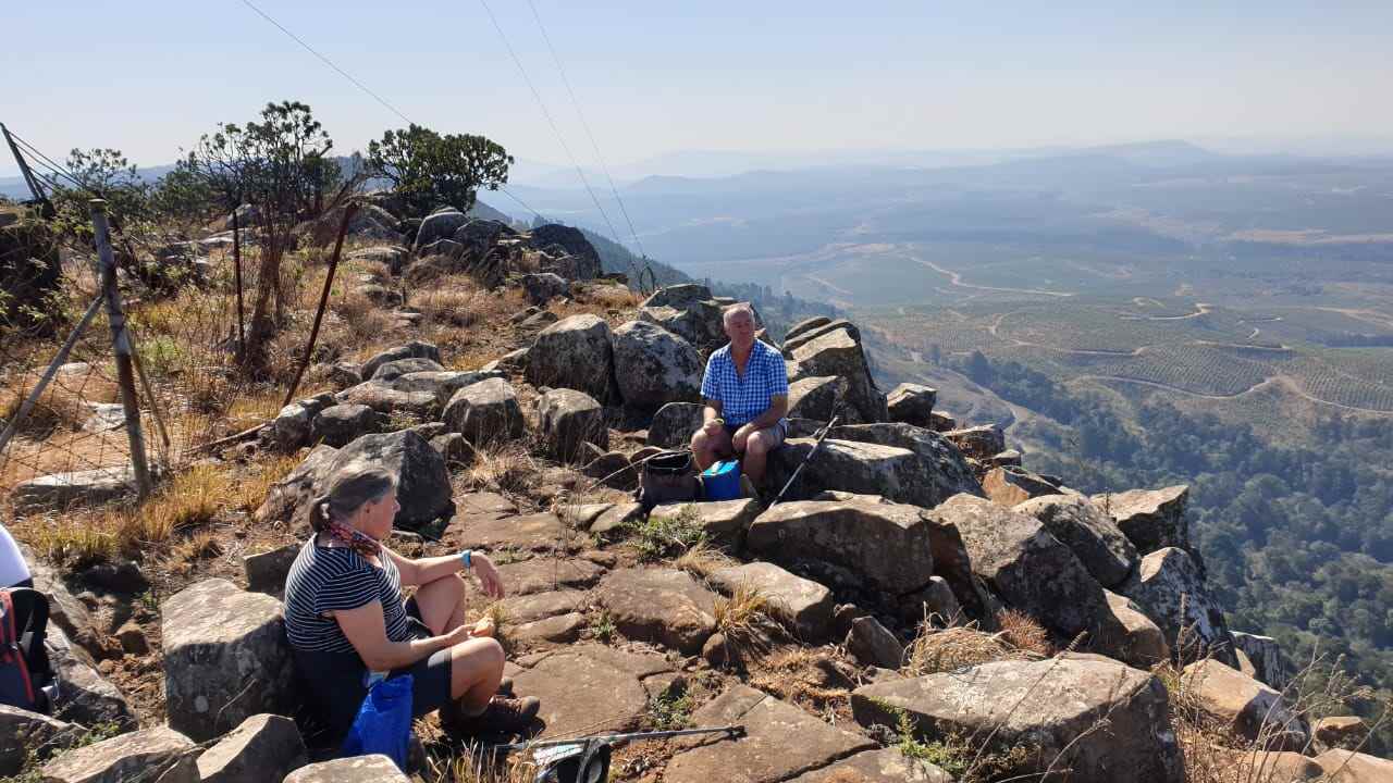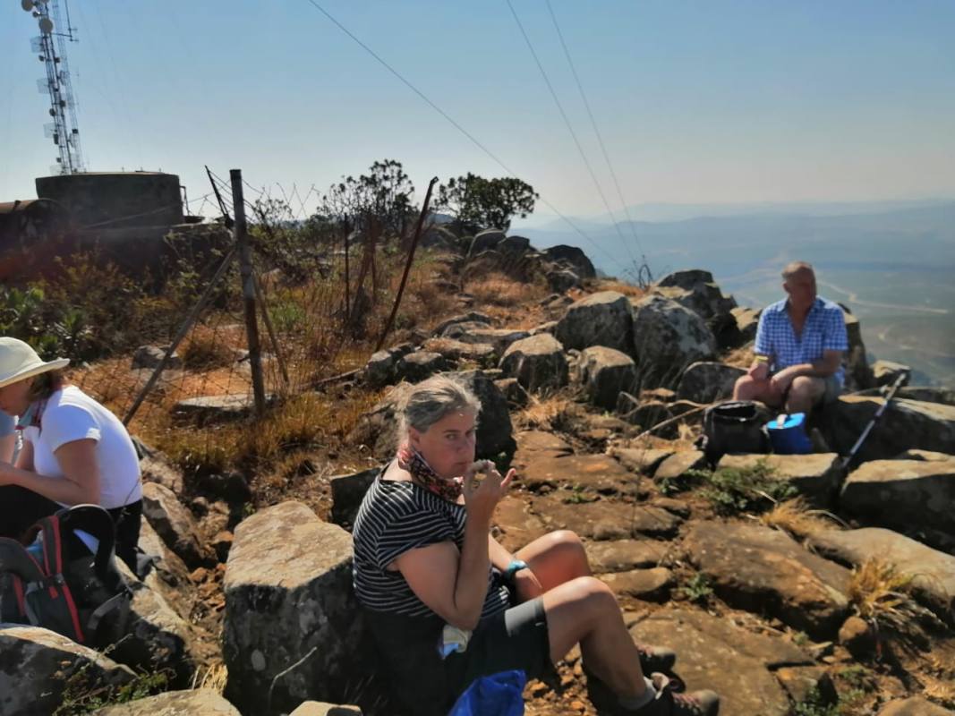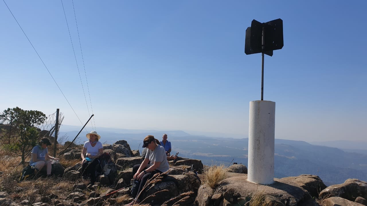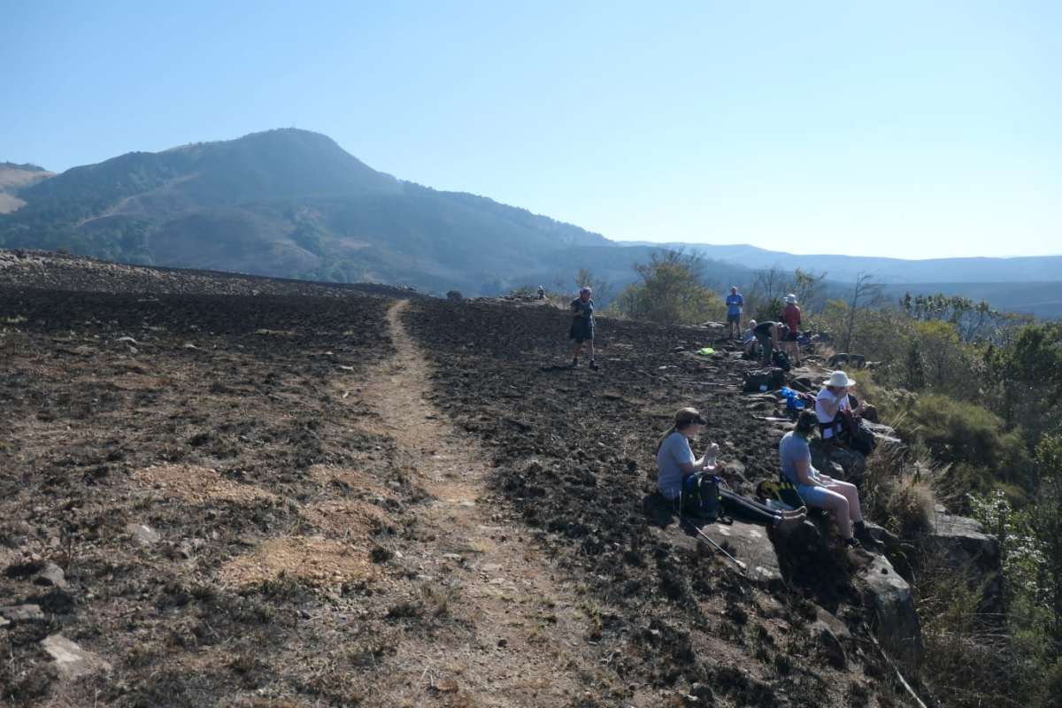 With great enthusiasm, the 11 of us walked steadily up the very steep and wooded forest walk, ducking every now and then as vines and trees had grown freely, making it a true adventure in the forest. Slow and steady, although having to stop to regain the heartrate was most welcome. Finally winding through the leaf covered pathway, we turned towards the waterfall walk, somewhat straighter and more level, and avid photographers reached for their phones to capture the early morning dappled sunlight hitting the bright green young ferns and twisted vines. Passing the clivias which are well known for their show in September showed no sign of buds, but promised a beautiful spectacular when the time is right for the mere quantity of them massed together naturally. Finally after a 45 minute climb all 11 hikers welcomed the gentle sun on our backs as we took a break for snack time and overlooked the first glimpse of the view before us. Below - the hazy vast farmlands that seemed to go on forever, and above - sighting the altitude we were to climb to reach the masts at the top of Gilboa. Daunting if straight up was the route, but thankfully the next leg before the next regroup point was a steady walk on a freshly burned hillside towards a cluster of trees to shield us from the sun once again.