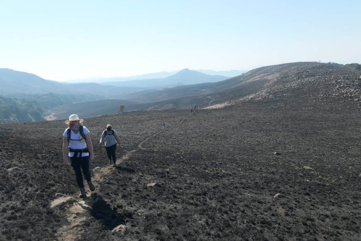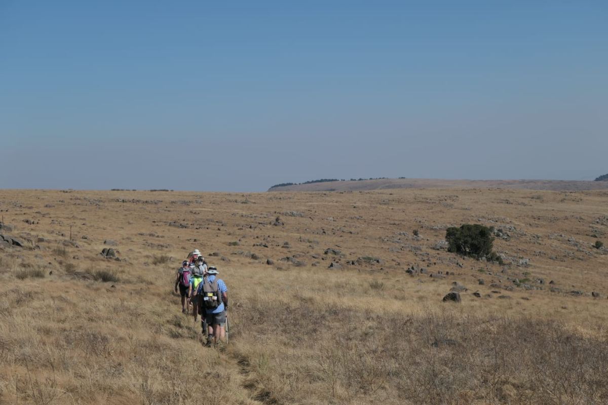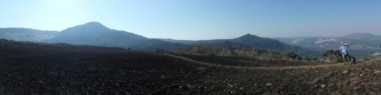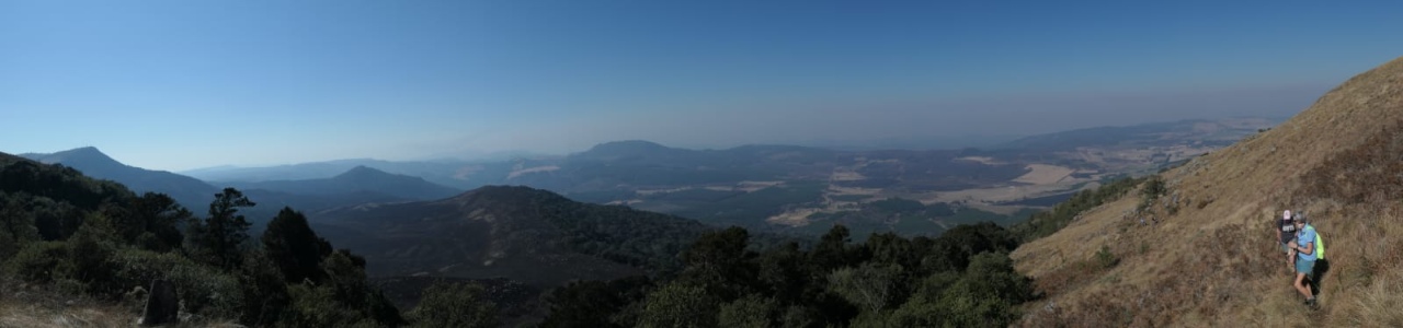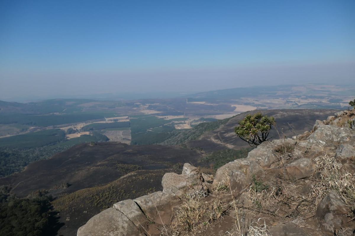 With great enthusiasm, the 11 of us walked steadily up the very steep and wooded forest walk, ducking every now and then as vines and trees had grown freely, making it a true adventure in the forest. Slow and steady, although having to stop to regain the heartrate was most welcome. Finally winding through the leaf covered pathway, we turned towards the waterfall walk, somewhat straighter and more level, and avid photographers reached for their phones to capture the early morning dappled sunlight hitting the bright green young ferns and twisted vines. Passing the clivias which are well known for their show in September showed no sign of buds, but promised a beautiful spectacular when the time is right for the mere quantity of them massed together naturally. Finally after a 45 minute climb all 11 hikers welcomed the gentle sun on our backs as we took a break for snack time and overlooked the first glimpse of the view before us. Below - the hazy vast farmlands that seemed to go on forever, and above - sighting the altitude we were to climb to reach the masts at the top of Gilboa. Daunting if straight up was the route, but thankfully the next leg before the next regroup point was a steady walk on a freshly burned hillside towards a cluster of trees to shield us from the sun once again.