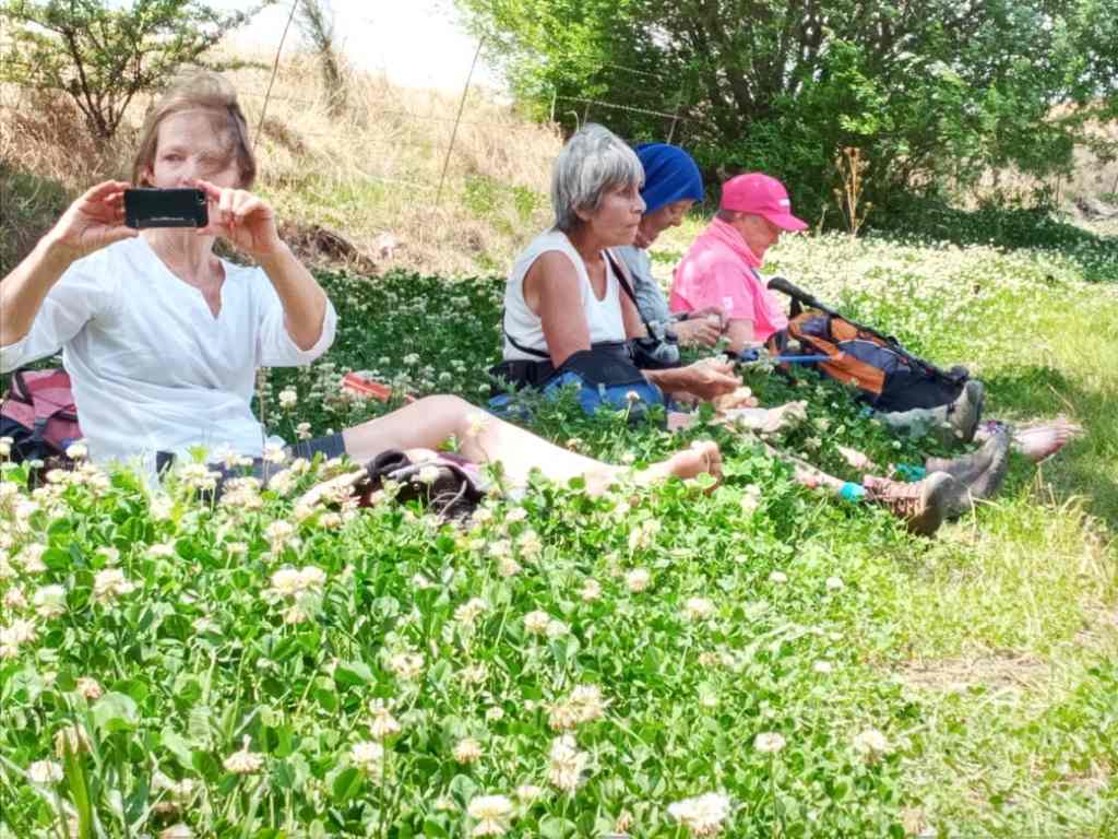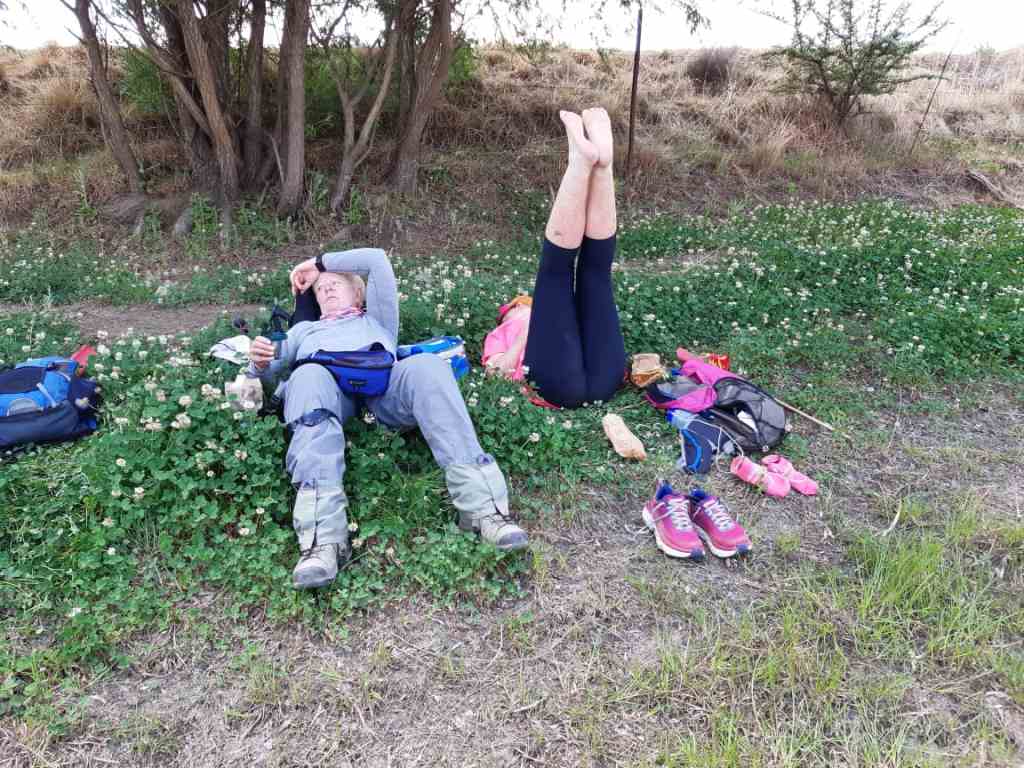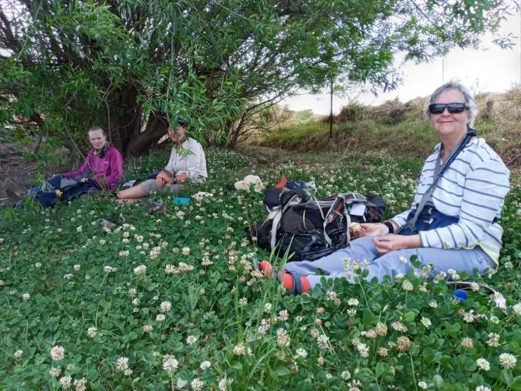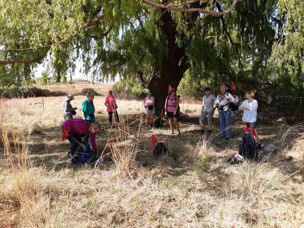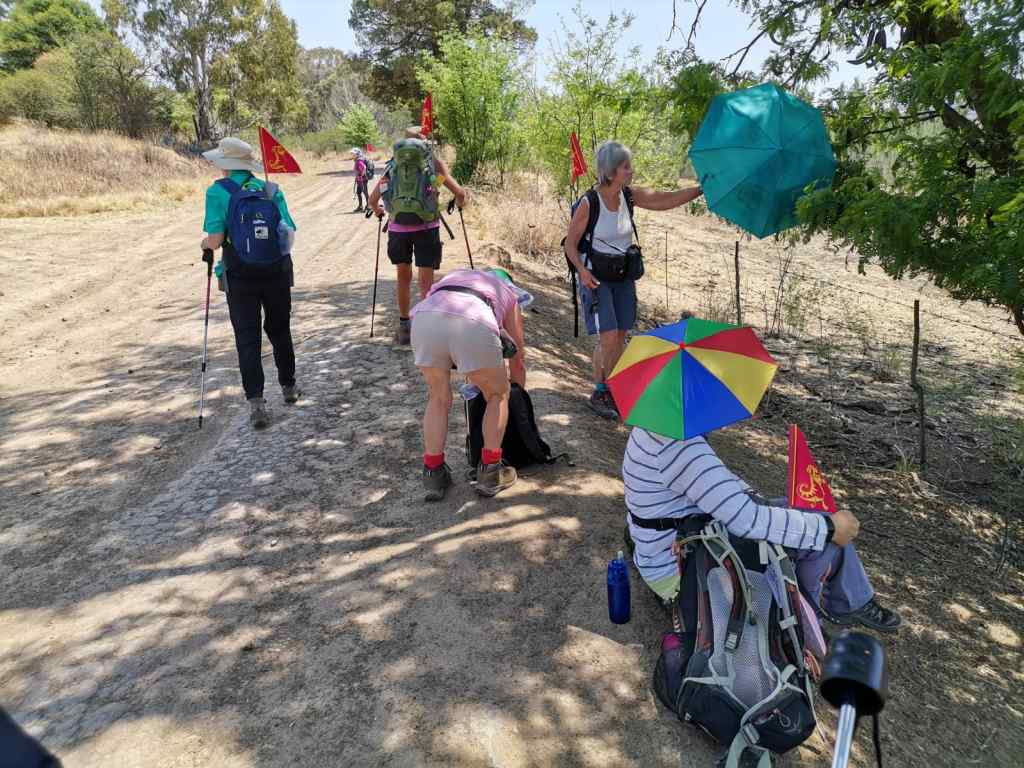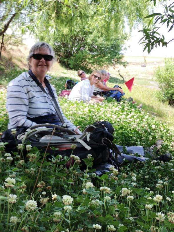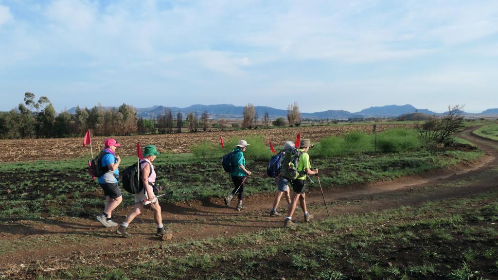 Reluctantly we loaded our packs and set off on the final stretch to our next overnight stop. Willowdene Guest Farm was ready for us, old sandstone block farmhouse with huge rooms and the ever present wrap around veranda, just gorgeous. Our meal already prepared, with breakfast and lunch in the wings all waiting for us to help ourselves, what a feast! ![]() Day 2: The new day brought celebrations as both Carolee and Este shared their birthday on the 26th, having been born a few hours apart!! We set out early, hoping to avoid the midday heat, already fancying the celebratory champagne that would be waiting with the evening meal. Our walk that day was to be the longest at 24.6kms. We pushed through the first 10 and came upon a small grove of trees, which was quickly put to use without argument as food packets were unpacked and breakfast was had, despite the fact that the shade was being shared on the other side of the fence by a piggery, complete with mother and babies as well as grumpy dad and his harem of young ladies. All in a day's hike!!