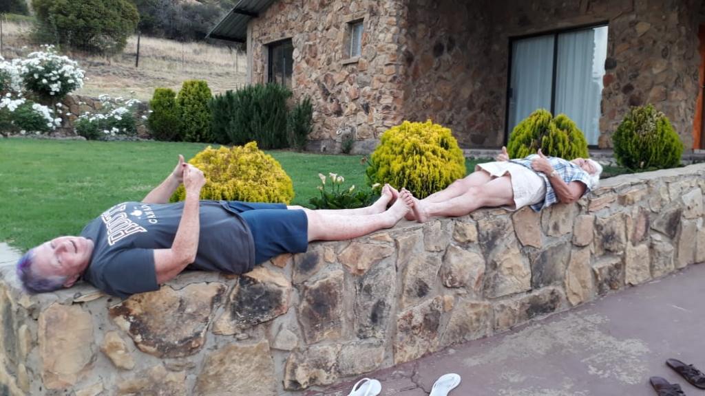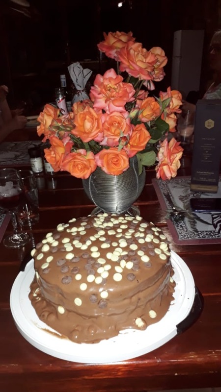 Uitzicht Game Farm was well worth the distance, after finally climbing up the 3.5km driveway, we reached our accommodation under the steady eaves of a rock infested kopje looking out over the valley below. The young and not so young, hot and exhausted, jumped into the swimming pool fully clothed to much raucous laughter. This was to set the stage to what was going to develop into a very festive evening. Our hosts had baked a triple layer chocolate cake and arranged our huge table with fine dinnerware including a large vase of beautiful orange roses from the garden. We sang the happy, happy song as is appropriate, in competition with a magnificent electric storm that rocked the hills and valley below us. A storm so welcome as the farmers were desperately waiting to plant in fields freshly ploughed or recently seeded. It seemed the perfect occasion to be rejoicing.