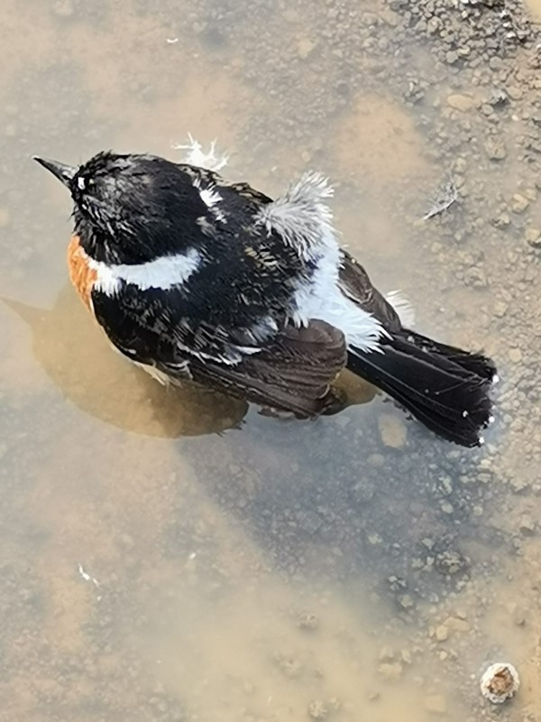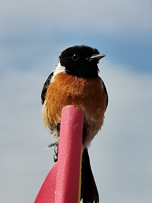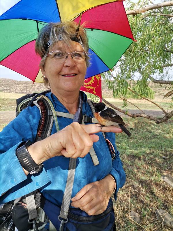 After devouring a banquet with fizz a-plenty and with bellies aching from laughter, our numbers slowly peeled away until the lodge was left quiet with only the odd grunt of contentment. ![]() Day 3 dawned fresh, with the smell of the rain still poignant. It was thankfully slightly cooler. Today stands out for all of us as today 3 of our group found a little African Stonechat, soaked in a huge road puddle and clearly waterlogged, unable to fly. Sylvia carefully lifted him out and after a while as he recuperated he flew onto Este's shoulder and then onto the top of Ali's Sungazer flag, where he tightly hung on as the wind whipped the flag around him as Ali retraced her steps to a Willow tree, where he was lifted into the branches by Este. He twittered off up into the branches higher up, apparently well recovered from his 'taxi' ride on the flag. He has become our mascot.