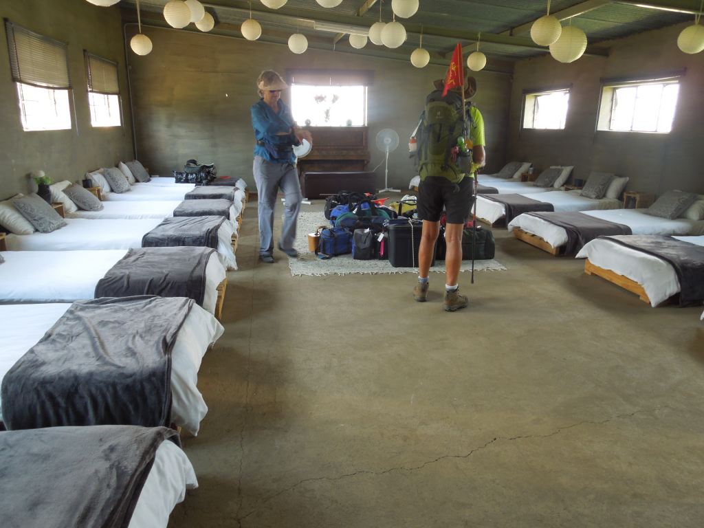 As we approached Emden Guest Farm, we heard what sounded like gunshots echoing off the Krantz around us. It sounded like target practice and we all had our versions of why this would be necessary... but we found out later, that this was deliberately done to scare the birds off the fruit harvest! It was not in readiness for battle after all... In fact, the next morning after leaving the farm, we saw one of the beaters responsible for these loud bangs. It was manmade!! Literally he was slapping what looked like a flattened hose onto the ground between the trees, it resulted in an incredibly loud bang. At Emden Guest Farm, we were greeted to the milk shed that was to be our accommodation, through a dining room that looked as if it had materialized from the pages of a wedding magazine, complete with a chandelier and white roses in big vases!! The 'barn' had 14 beds on pallets, each with a pedestal again adorned with vases of roses, everything in white, from the roof there hung different sized white Chinese lanterns and outside on the soft generous lawns a blanket with big cushions and garden chairs laid out to receive our weary bodies. Such hospitality was at times quite overwhelming.