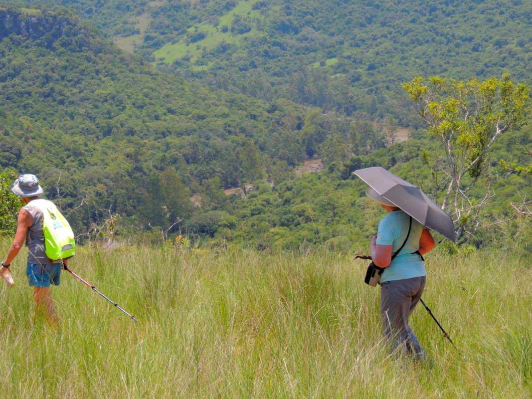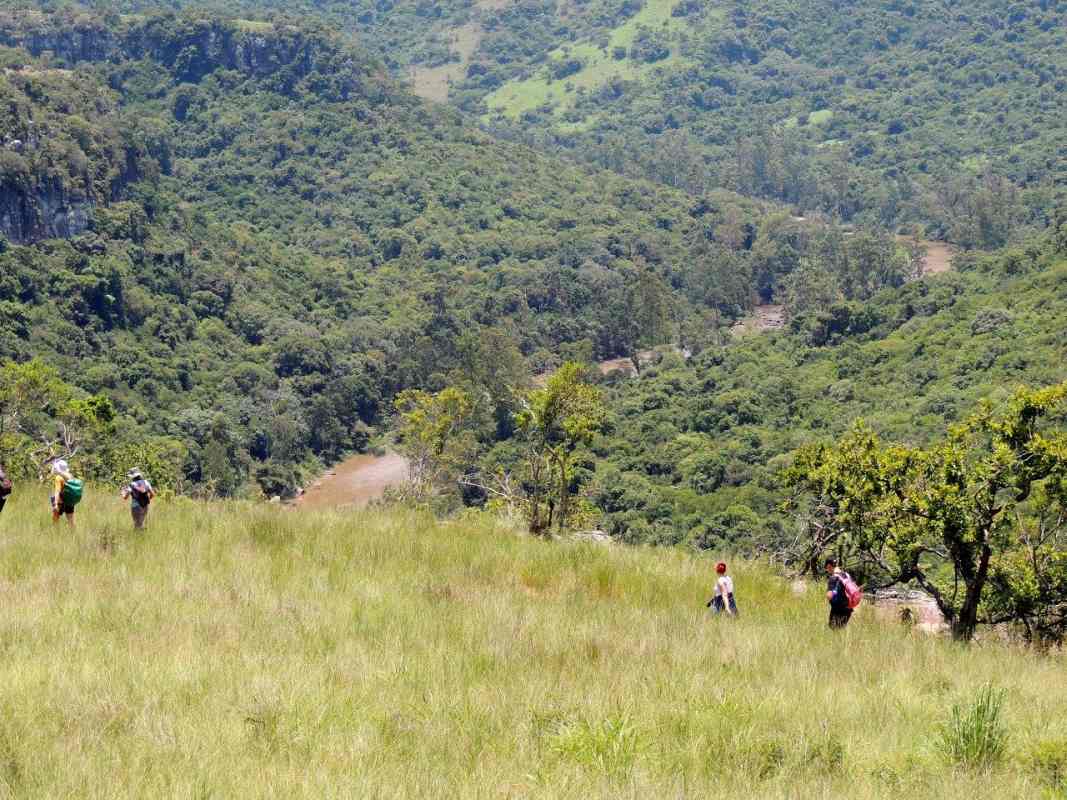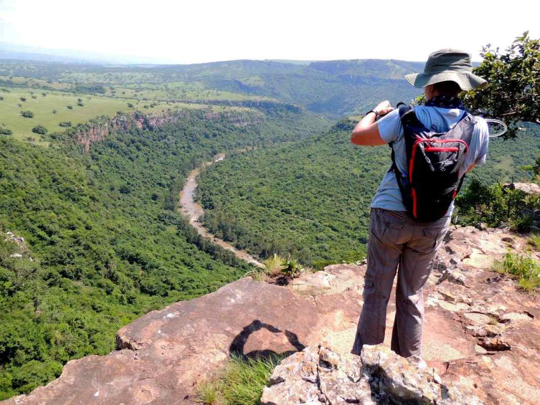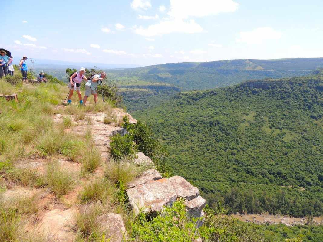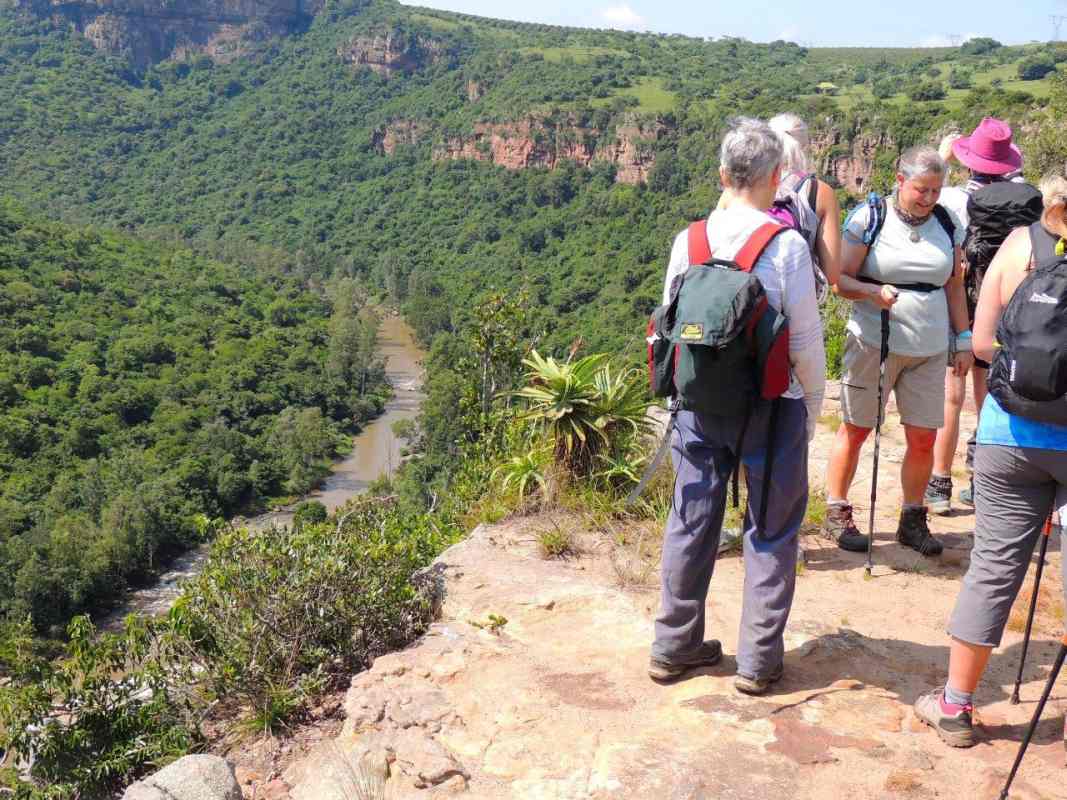 Libby led us up to the top of the gorge where we could see the Umgeni River meandering far below from the top of the Krantz. The view seemed to roll out around us as far as the eye could see. We sat in the shade of the trees for a while absorbing the beauty, the rocks around us were naturally tiered down to the drop, looking like a professional landscaped garden, each tier boasting aloes or shrubs and small trees with an undergrowth of unknown greenery. A perfect spot for a photo shoot.