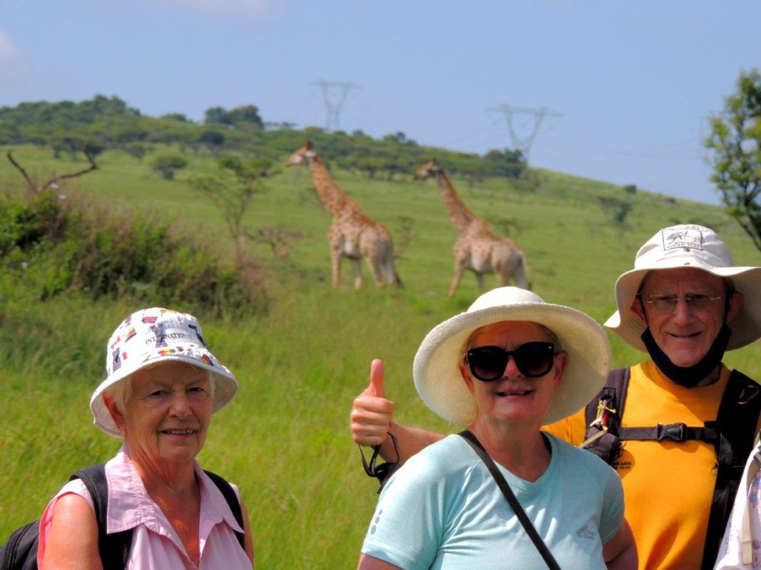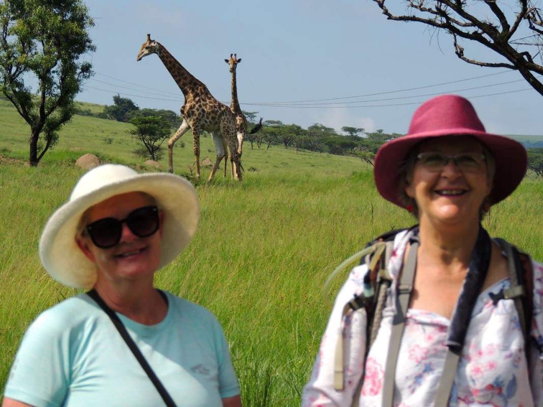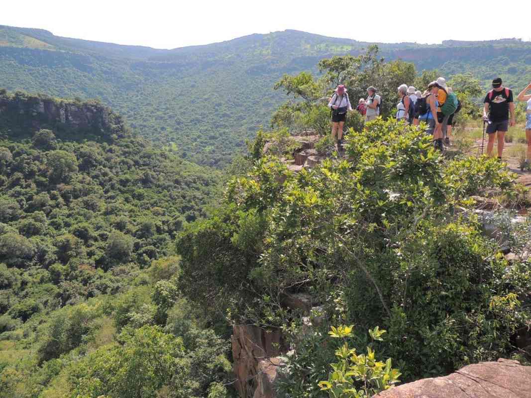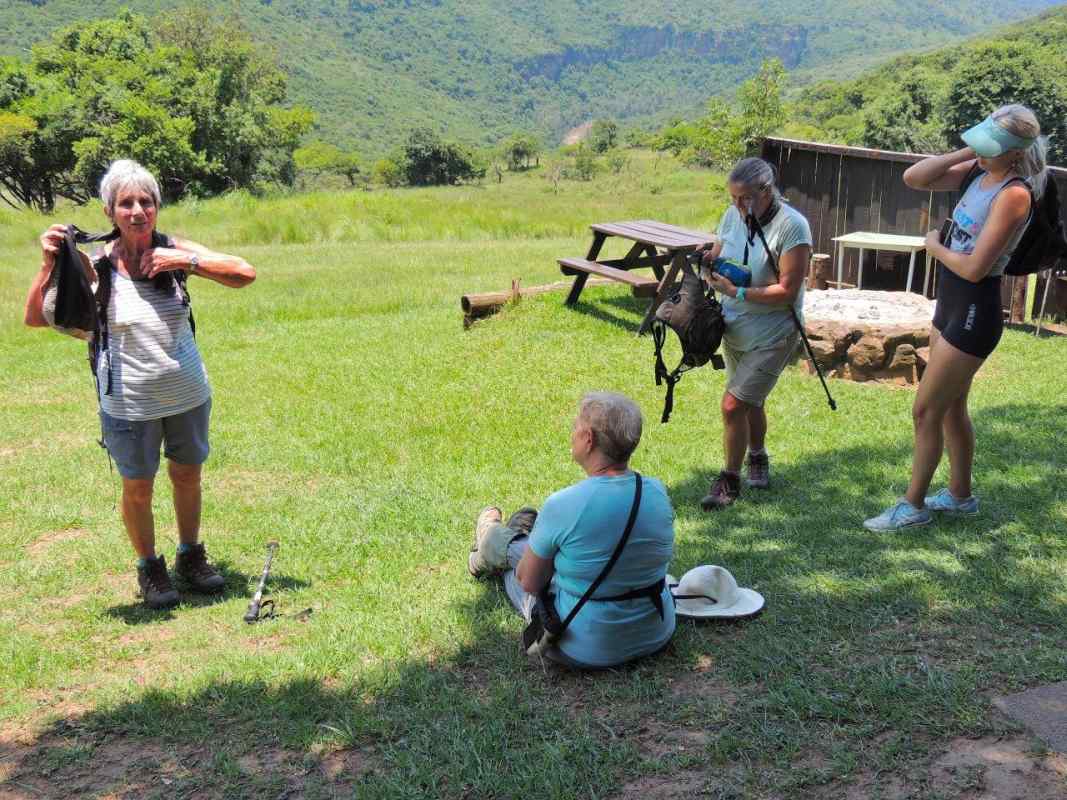 We left the cars, walking towards the high road, crossed a little bubbling stream that later dropped down into a waterfall, came across a colony of beautifully painted, green locusts and as we carried on along the top of the Krantz we were curiously watched by giraffe who seemed fascinated by us, wondering what species we were and whether dangerous or not! Far too noisy and animated so we were given the nod.