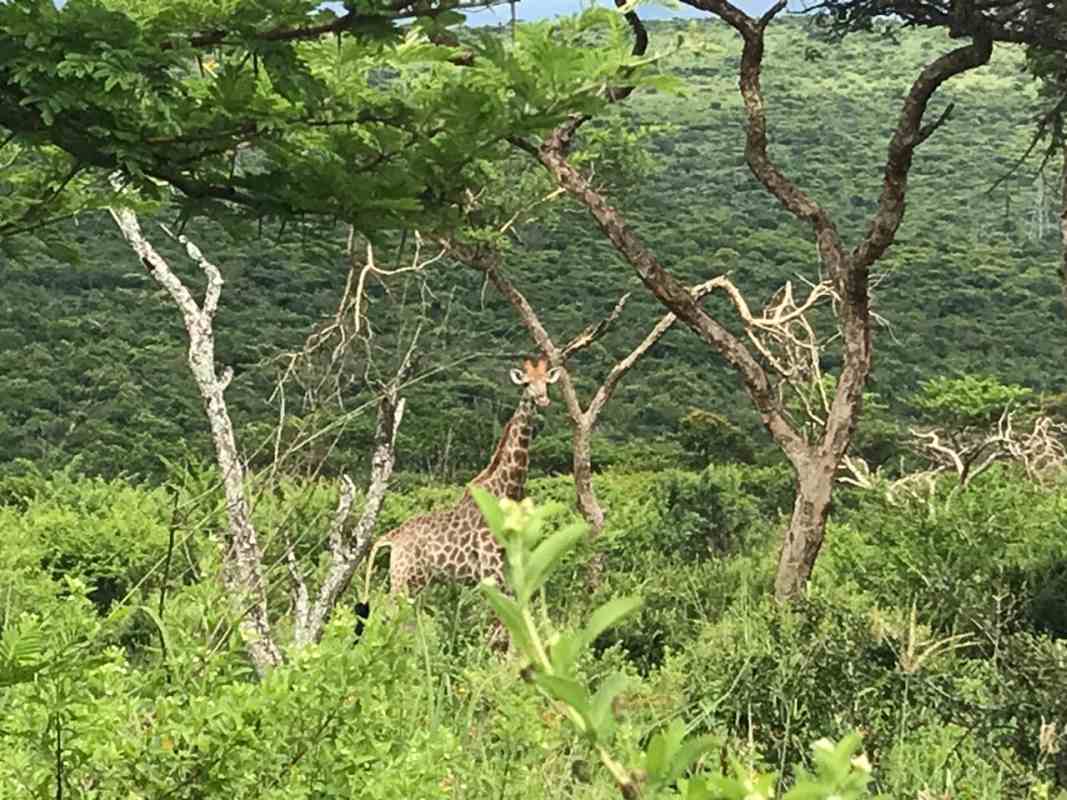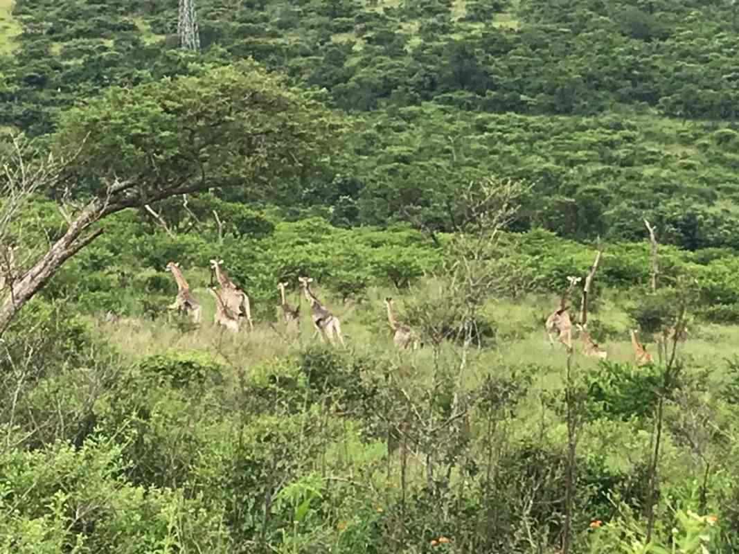 At the start we saw 2 adult zebra and an engaging young zebra calf nestling close to its mother. It was an easy walk up to the reservoir where we enjoyed the view across Maritzburg and the hills beyond from this high point. Then it was a bundu bashing exercise going down, down, trying to find a game trail here and there... hiking through long green grass, dodging thorny branches and tendrils, sticks and stones under foot, concentrating on finding our way through the thick bush. Looking down the valley, suddenly we saw animals... a couple of elegant heads peering at us, their long necks like cranes above the tall grass. Giraffe! Then more and more came into view, peering at us curiously, little ones close to their mothers, juveniles, teenagers, big daddies with their dark markings. They cantered away from us, necks and legs moving rhythmically, a big one taking the rear, just like Chris Dobson takes up our rear on hikes! Carolee counted 19 giraffe. It was a magical sight! It left some of us wondering "what is the collective noun for a group of giraffe?" a herd? Someone suggested it was a "tower of giraffe" and how right she was, when I consulted Google later that day. The other collective noun used colloquially is a "journey of giraffe". Both are very apt expressions.