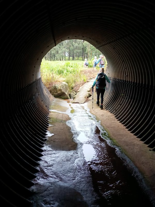 Soon we entered a pine plantation, aptly called "Heaven". There in "Heaven" we found the pink love and kindness stone which Ali had previously placed on the head of a quirky little gnome, pinned to a tree. We emerged from the forest just after 1 p.m. and there was the clubhouse. With muddy boots , tired legs and cheerful smiles, we said our goodbyes to most of the party. It was a very enjoyable 15 kms hike. A small group of us stayed to enjoy welcome cappuccinos on the lawn outside, spreading our chairs for social distancing.