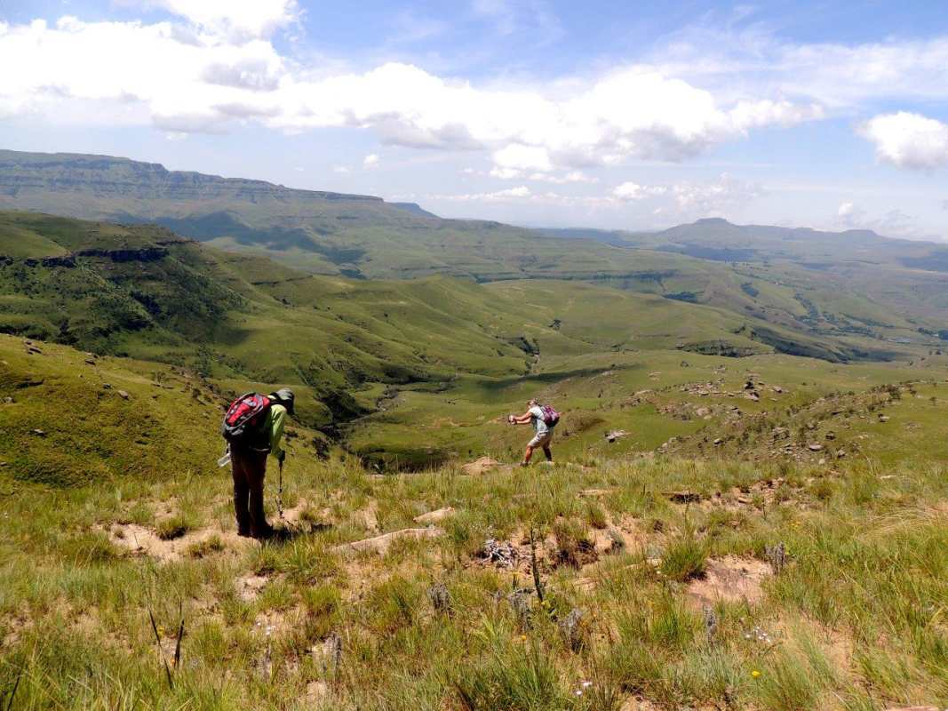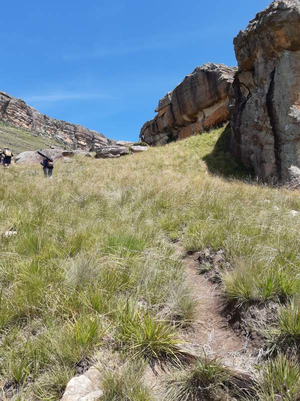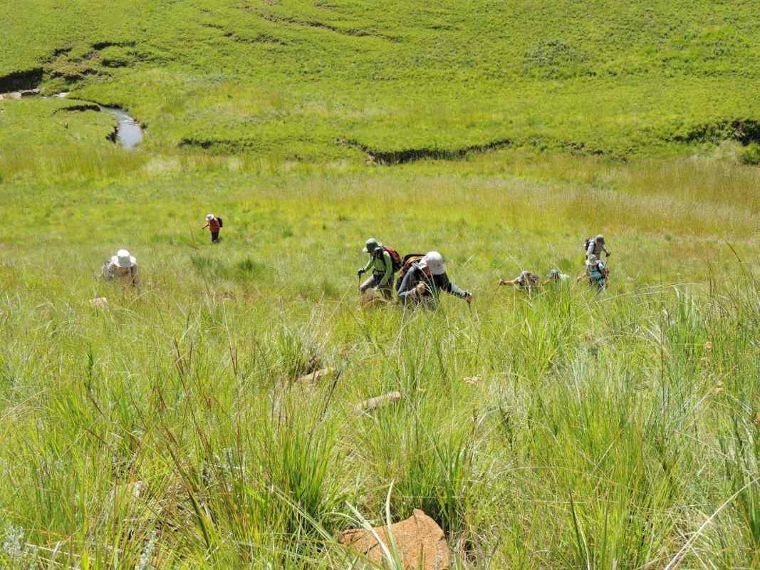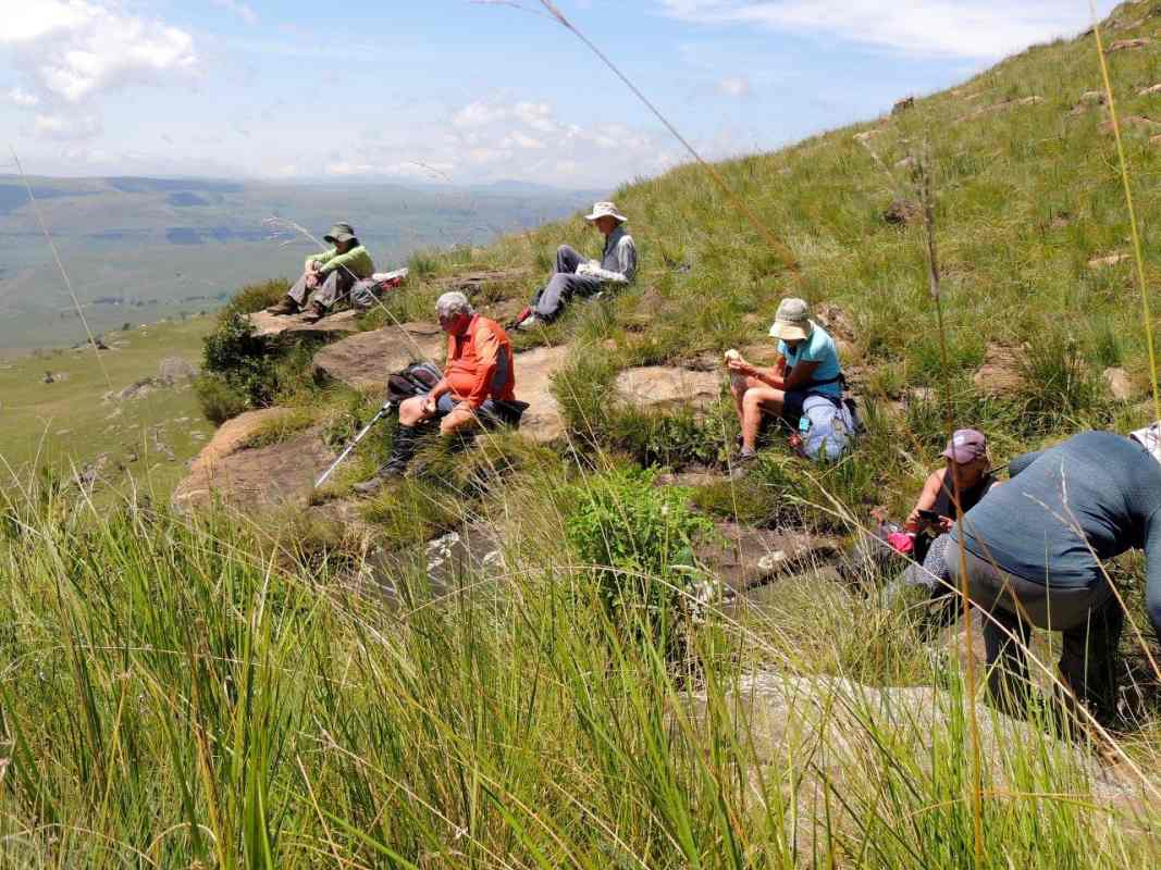 Mkhomazi is a very little visited Drakensberg Nature Reserve situated between Kamberg and Loteni on the Loteni road. The nature of the geography of this reserve is very broken and steep, with long steep inclines, high cliffs and steep, deep valleys. Magic waterfalls pop up all over the cliffs during the rainy season. The main attraction to this area is to overnight in McKenzie's Cave. A cave in a valley on the other side the highest ridge in the are. A brutish, no stop climb over a very short distance. On the way, if you know where to look, is a deep cliff hanger of a waterfall, which can be spectacular in the rains, and if you are not afraid of vertigo. From the office to the waterfall is just a hard slow pull, up and up and up. There is no break in the climb, and no shade. This waterfall was going to be our lunch spot, then down, down, down the same way to the cars. The sun did not adhere to the weather forecast for a cool overcast day, but came out all guns blazing, we were sweating as we waited to start at the car park.