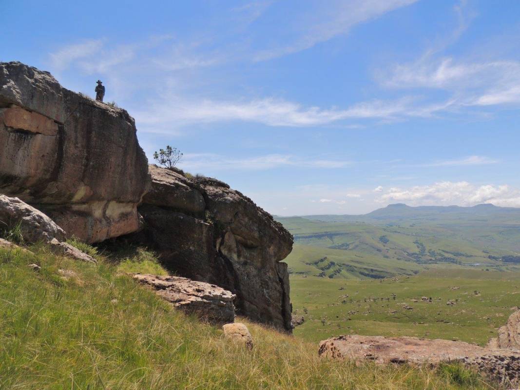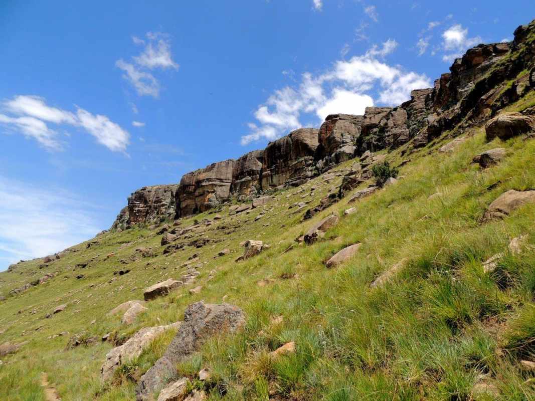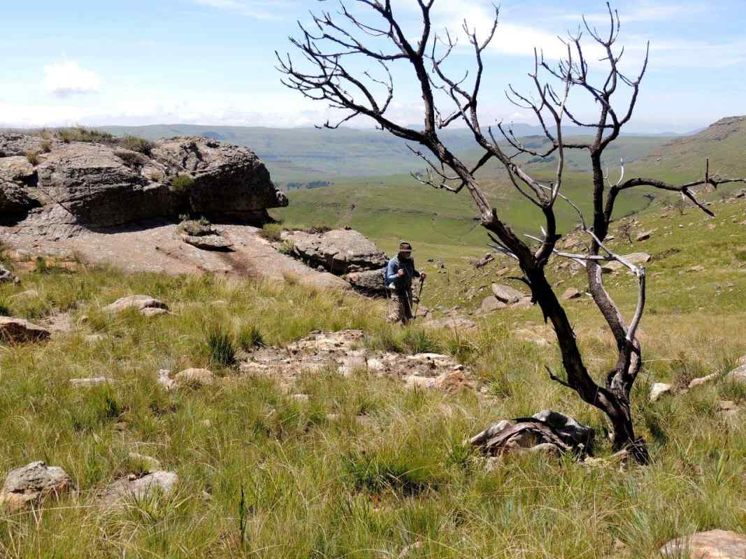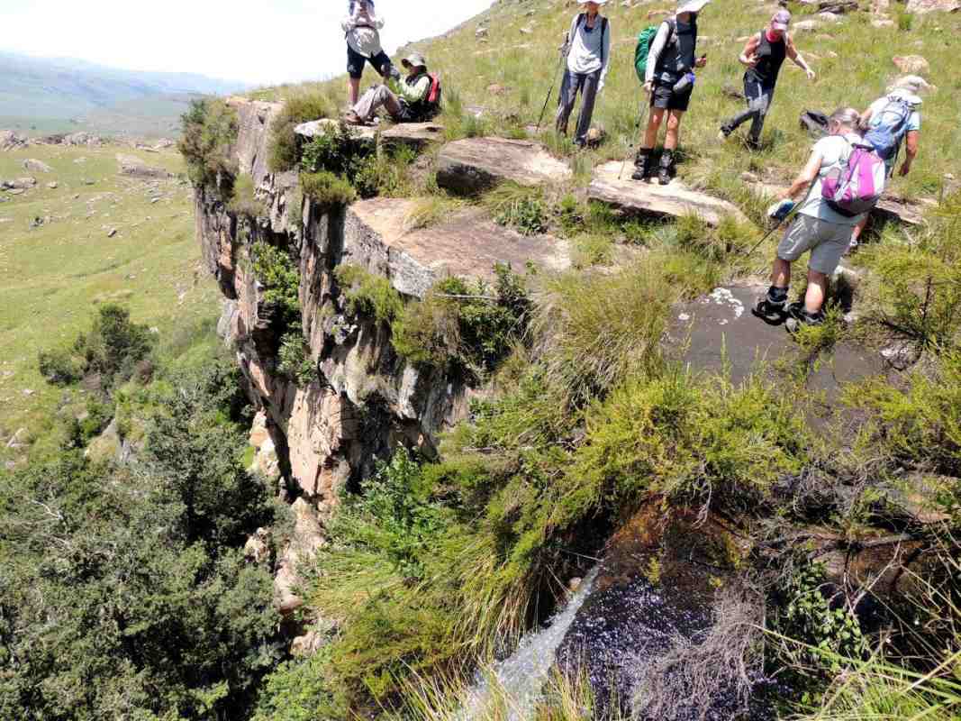 Mkhomazi is a very little visited Drakensberg Nature Reserve situated between Kamberg and Loteni on the Loteni road. The nature of the geography of this reserve is very broken and steep, with long steep inclines, high cliffs and steep, deep valleys. Magic waterfalls pop up all over the cliffs during the rainy season. The main attraction to this area is to overnight in McKenzie's Cave. A cave in a valley on the other side the highest ridge in the are. A brutish, no stop climb over a very short distance. On the way, if you know where to look, is a deep cliff hanger of a waterfall, which can be spectacular in the rains, and if you are not afraid of vertigo. From the office to the waterfall is just a hard slow pull, up and up and up. There is no break in the climb, and no shade. This waterfall was going to be our lunch spot, then down, down, down the same way to the cars. The sun did not adhere to the weather forecast for a cool overcast day, but came out all guns blazing, we were sweating as we waited to start at the car park.