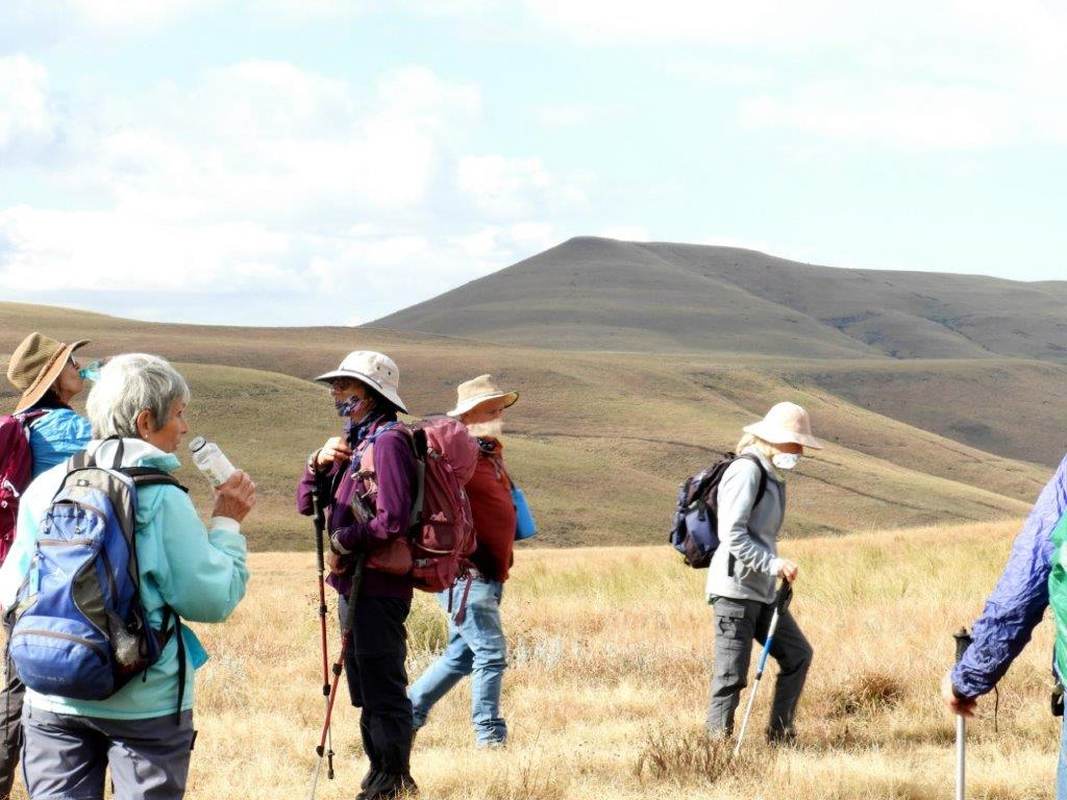 The path was lost in very long overgrown and lying down grass, so a new detour was taken across the seeming never to end undulating, pathless grass lands. However we came to the area where we had stopped the recce yesterday because of no path ahead of us, found our tracks and followed, and soon were back on the homeward track. A breather was taken once were on a god track, and looking back we could see the high ridge of Mt Lebanon, our goal for the day.