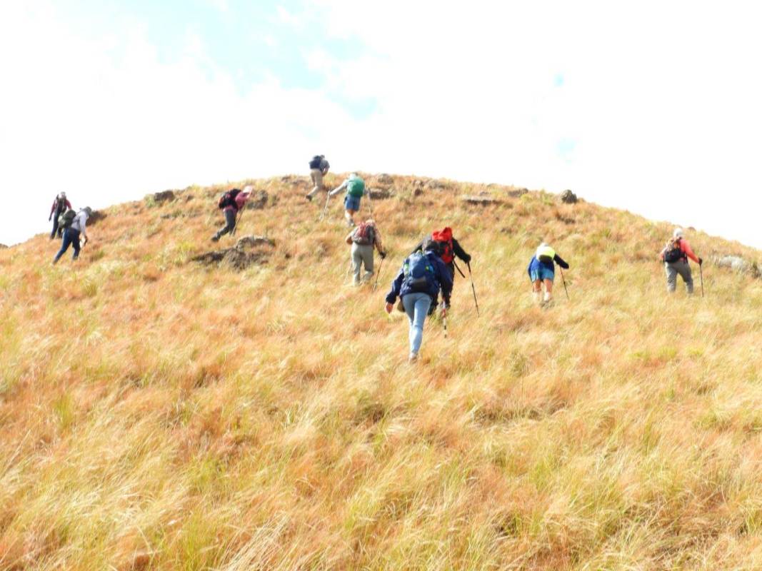 Mt Lebanon loomed, the path was hidden under long grass, and in places washed badly making walking quite difficult. A slow steady ascent at each hikers own pace and path, and soon all were on top.