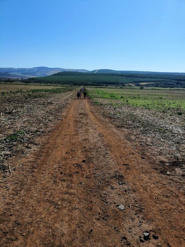 The first section of the walk took us down a tree lined road, neatly spaced on either side like two rows of Grenadier Guards greeting our arrival. We emerged into open mealie lands stripped of their crop with grazing cattle ambling in search of titbits. We came across the carcass of a Grey Duiker that had succumbed to a predator very recently. The chest and stomach area were stripped clean leaving only the head and limbs as the remaining shell of the animal. Most of us "City Folk" feel a sadness and sympathy for such creatures but the reality is that it kept another or others alive in the whole cycle that is nature. There was no spoor to identify the predator but my guess was either a dog/s, jackals or even Caracal! There was much evidence of abundant wildlife on the farm so in general the animals must be well protected.