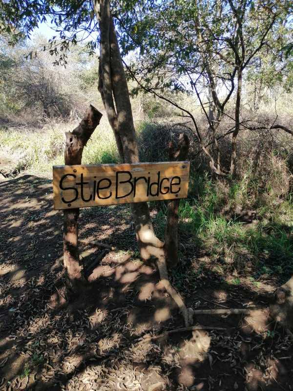 We crossed the last section of open cropland and entered the riverine forest and trail next to a strongly flowing stream. Again, everything we saw confirmed what a well-run property this is. Neat signage, indicator dye and ring barking on alien trees and significantly, plenty of spoor - small and large antelope, water mongoose, slender mongoose and Bush Pig, their presence indicated by frequent grubs along the pathway. We also had a fleeting glimpse obscured by trees of what were almost certainly three Bushbuck, the only other possibility of that size being Reedbuck, but there was no characteristic alarm whistle so the former was probably the correct entry on the checklist! This time of the year is not the best for identifying trees and species diversity is much lower at this inland altitude but we saw Dovyalis sp. Coddia rudis and a large number of Halleria lucida with their nectar laden yellow to orange flowers strewn on the path at intervals. After approximately an hour and a half's walk Brian led us over a low level bridge, necessitating a removal and carrying of 'tackies,' and brief immersion in icy waters. We stopped briefly for tea and scones on the other side and then headed uphill to the contour road through a wattle plantation, offering beautiful views over the farm and its immaculate infrastructure including orchards, crops and a famous Piggery!! All along the road we checked for spoor with plenty of evidence of wildlife and occasional dog tracks. We descended once again to the farmlands below and crossed a simple timber and cable suspension bridge certified safe to cross by the Trails Resident Engineer and leader Brian! After a further walk back alongside the stream we stopped for lunch and enjoyed the warm sunshine filtering through the trees.