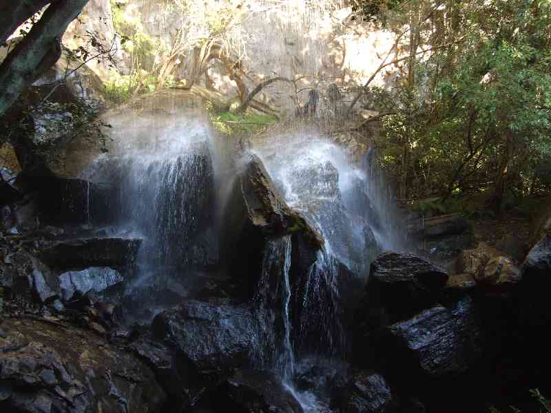 What intrigues me about this photo of water cascading over Dinosaur Cave are the sharp contrasts and whiteness of the water giving a rather sinister appearance, Dave Sclanders describes the scene "Water casscades over the cave area and provides a freezing shower (took my breath away as I stood beneath it)" been out in the mountains a bit long I think... Report is at �Dinosaur Cave�. (Click on the photo to give an enlarged image)