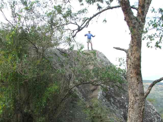 An interesting point of discussion was the flowering and fruiting of the Natal Cabbage Tree , This tree takes a long time to first flower , and according to Selven once the flower heads come out , they take 2 years to flower. Following the valley road through the high grass vegetation we saw a “Bushbuck Ram” , looking at us from down the road. By the time I had the camera ready , it had turned , and ran off down the road.In the valley is a high rock , where the more adventurous members pitted their skills at getting toe the top. Here we see Keith standing on the high point of the rock