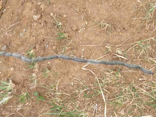 After a lunch at one of the campsite s , we set off down the road which did a bit of a loop , then a steady long climb to get back to the top of the valley. On the way we passed several “Hary Caterpillar trains”. These caterpillars formed long trains of caterpillars holding nose to tail across the roads. In more than one place we saw lines of squashed caterpillars where a vehicle had run over them. So much for “safety in numbers.”