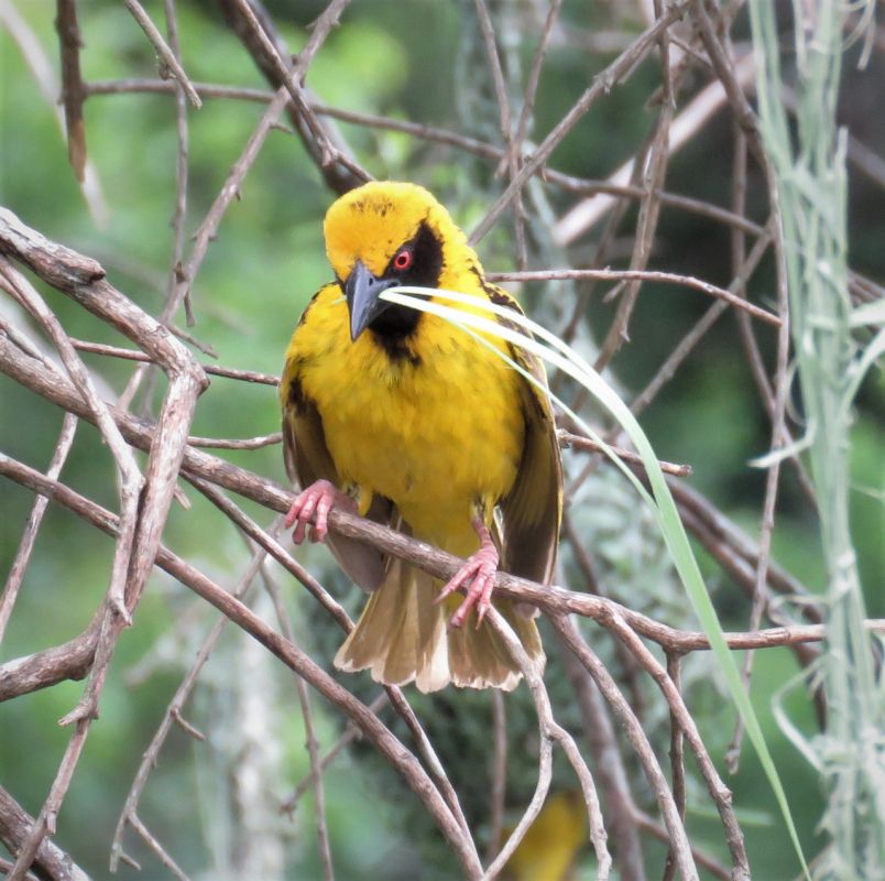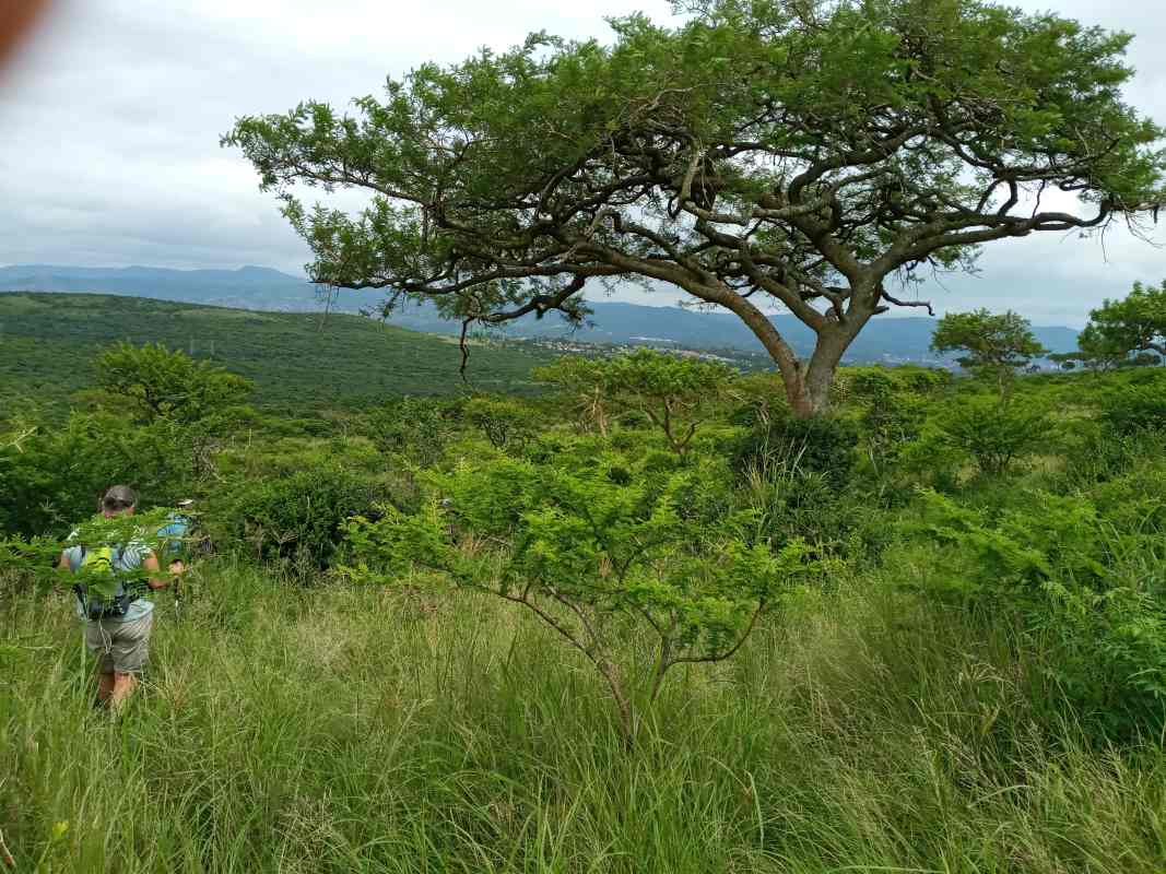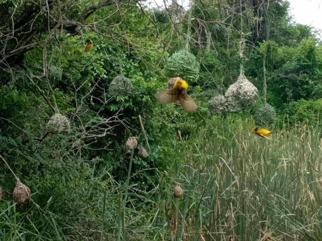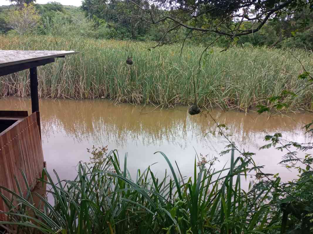 The path led us to the road and after a brief stop, we turned and followed more narrow tracks. Then a broad track opened up and after about 2 hours of hiking on narrow paths and bundu bashing, this was a welcome respite. The path opened out to a small dam with brown bulrushes, reeds and bird life aplenty. On the far side, shrouded by thick undergrowth and overlooking the dam, was a bird hide. Some settled themselves there on the benches to watch the clever weavers building their nests, hanging pendulously above the water. Fascinating to watch! The rest of us found places to sit around the dam and enjoyed our well deserved snacks and chats.