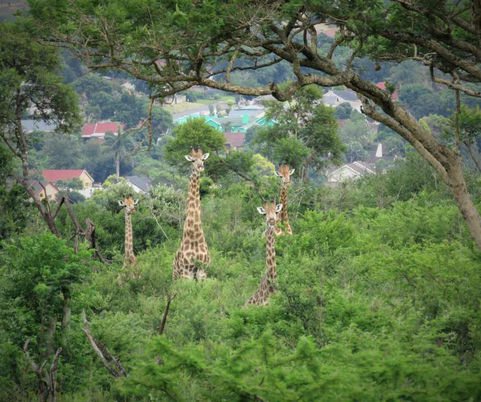 At the start we saw 2 adult zebra and an engaging young zebra calf nestling close to its mother. It was an easy walk up to the reservoir where we enjoyed the view across Maritzburg and the hills beyond from this high point. Then it was a bundu bashing exercise going down, down, trying to find a game trail here and there... hiking through long green grass, dodging thorny branches and tendrils, sticks and stones under foot, concentrating on finding our way through the thick bush. Looking down the valley, suddenly we saw animals... a couple of elegant heads peering at us, their long necks like cranes above the tall grass. Giraffe! Then more and more came into view, peering at us curiously, little ones close to their mothers, juveniles, teenagers, big daddies with their dark markings. They cantered away from us, necks and legs moving rhythmically, a big one taking the rear, just like Chris Dobson takes up our rear on hikes! Carolee counted 19 giraffe. It was a magical sight! It left some of us wondering "what is the collective noun for a group of giraffe?" a herd? Someone suggested it was a "tower of giraffe" and how right she was, when I consulted Google later that day. The other collective noun used colloquially is a "journey of giraffe". Both are very apt expressions.