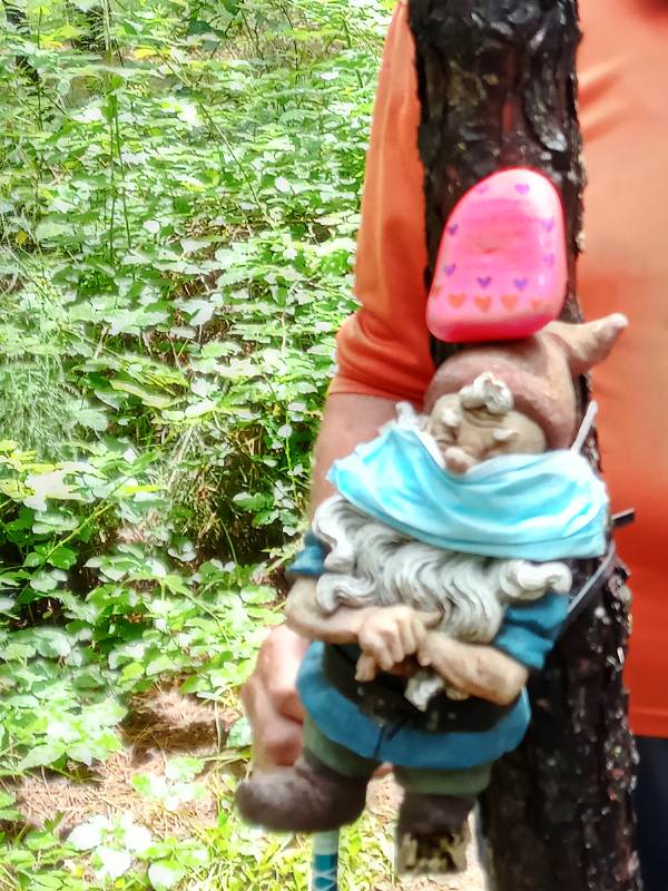 Soon we entered a pine plantation, aptly called "Heaven". There in "Heaven" we found the pink love and kindness stone which Ali had previously placed on the head of a quirky little gnome, pinned to a tree. We emerged from the forest just after 1 p.m. and there was the clubhouse. With muddy boots , tired legs and cheerful smiles, we said our goodbyes to most of the party. It was a very enjoyable 15 kms hike. A small group of us stayed to enjoy welcome cappuccinos on the lawn outside, spreading our chairs for social distancing.