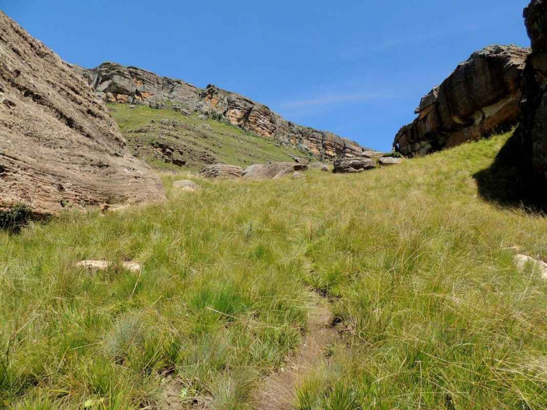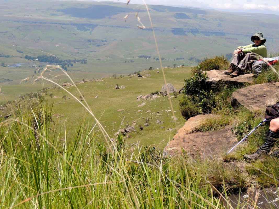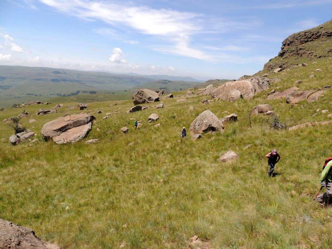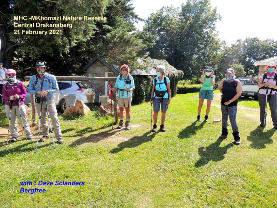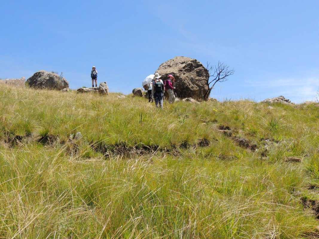 Mkhomazi is a very little visited Drakensberg Nature Reserve situated between Kamberg and Loteni on the Loteni road. The nature of the geography of this reserve is very broken and steep, with long steep inclines, high cliffs and steep, deep valleys. Magic waterfalls pop up all over the cliffs during the rainy season. The main attraction to this area is to overnight in McKenzie's Cave. A cave in a valley on the other side the highest ridge in the are. A brutish, no stop climb over a very short distance. On the way, if you know where to look, is a deep cliff hanger of a waterfall, which can be spectacular in the rains, and if you are not afraid of vertigo. From the office to the waterfall is just a hard slow pull, up and up and up. There is no break in the climb, and no shade. This waterfall was going to be our lunch spot, then down, down, down the same way to the cars. The sun did not adhere to the weather forecast for a cool overcast day, but came out all guns blazing, we were sweating as we waited to start at the car park.