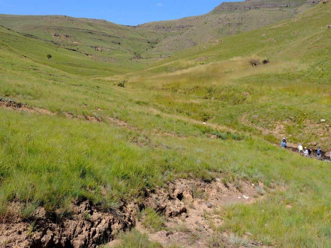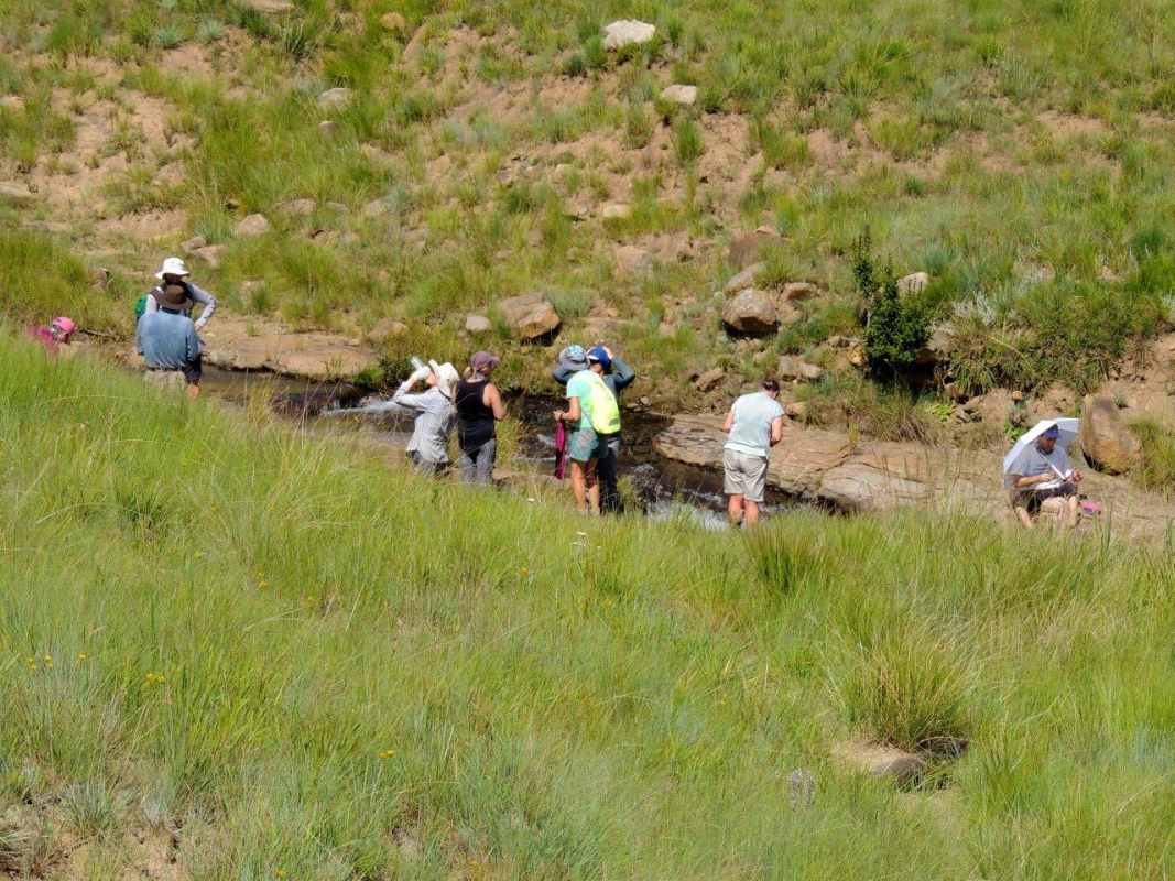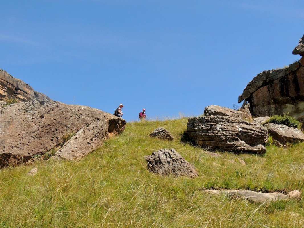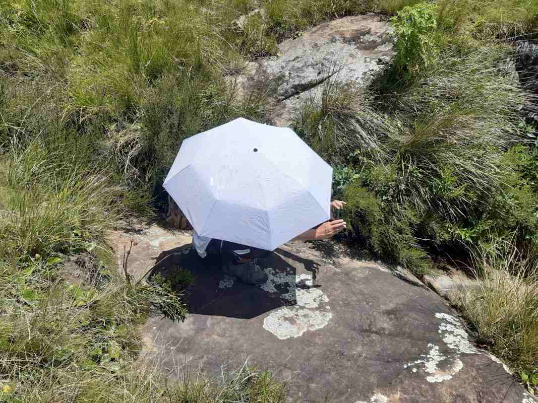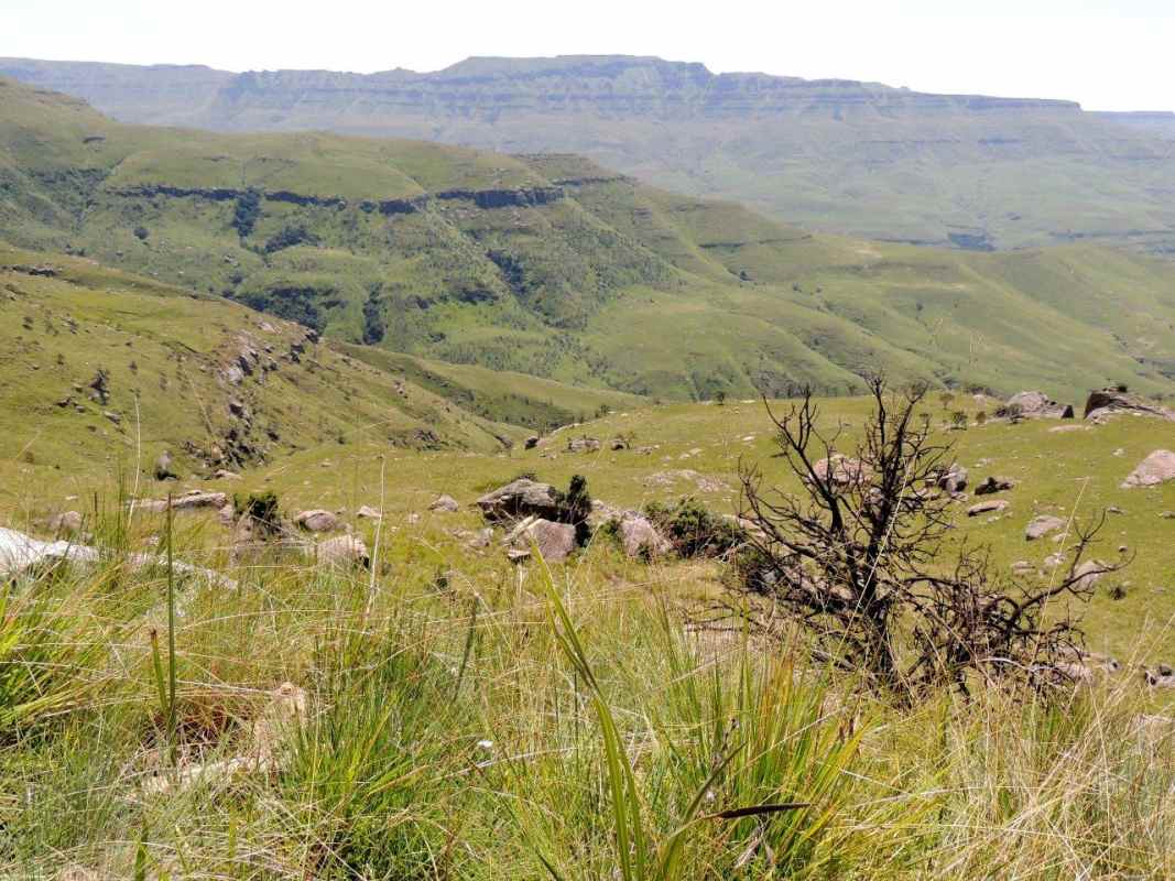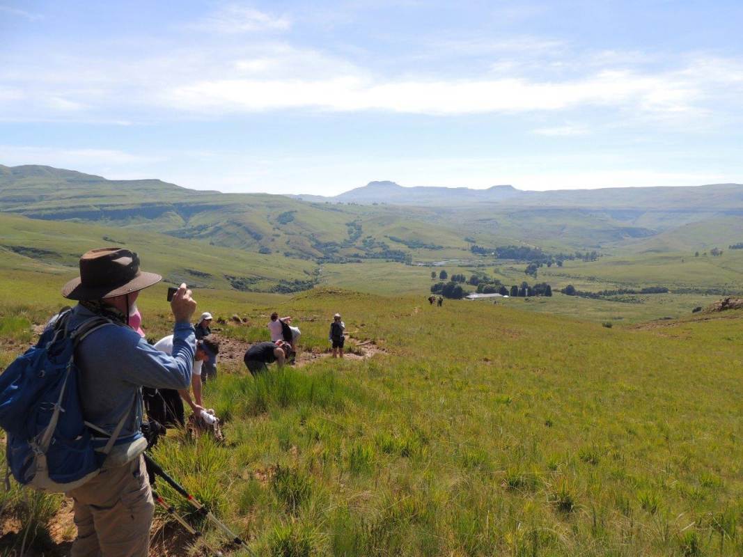 Mkhomazi is a very little visited Drakensberg Nature Reserve situated between Kamberg and Loteni on the Loteni road. The nature of the geography of this reserve is very broken and steep, with long steep inclines, high cliffs and steep, deep valleys. Magic waterfalls pop up all over the cliffs during the rainy season. The main attraction to this area is to overnight in McKenzie's Cave. A cave in a valley on the other side the highest ridge in the are. A brutish, no stop climb over a very short distance. On the way, if you know where to look, is a deep cliff hanger of a waterfall, which can be spectacular in the rains, and if you are not afraid of vertigo. From the office to the waterfall is just a hard slow pull, up and up and up. There is no break in the climb, and no shade. This waterfall was going to be our lunch spot, then down, down, down the same way to the cars. The sun did not adhere to the weather forecast for a cool overcast day, but came out all guns blazing, we were sweating as we waited to start at the car park.